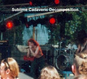 Als zweitens eroberten Sublime Cadaveric Decomposition die Bühne. Die 4 Franzosen, die ohne Bassisten angetreten waren, hauten den immer weniger werdenden Fans reinsten Grind Core um die Ohren. Sie nutzten die Zeit gut und brauchten, vor allem der Schlagzeuger, nur wenig Pausen um wieder zu Luft zu gelangen.(Willy)