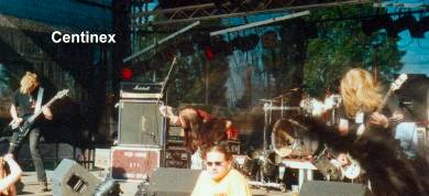 Obwohl die Schweden Centinex schon seit zehn Jahren durch die Szene tigern, ist ihnen der große Durchbruch bisher verwehrt geblieben – ein geradezu prädestinierter Fall für das "Fuck The Commerce"! Auf ihrer neuesten – fünften! – Platte "Hellbrigade" geht das Quintett doch hörbar in die In Flames / Dark Tranquillity-Ecke (die alten Werke dieser Bands wohlgemerkt), on stage geht es schon noch eine Ecke thrashig-derber ab, eindeutig ungeeignet für NuclearBlast und Konsorten. Den Nerv des Festival-Publikums traf Centinex hingegen schon, und auch mich machten sie neugierig! Da ich (bisher) noch keine ihrer Platten gehört habe, kann ich keine Informationen zur Ausgewogenheit ihres Gigs machen, dass es ein gelungener Auftritt war, steht aber außer Frage! Zumal es auf dem FTC immer wieder eine Wohltat ist, wenn eine Band auch mal die eine oder andere Melodie verwurstet... (Kai)