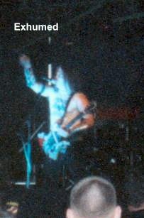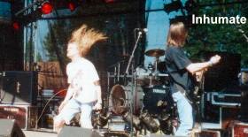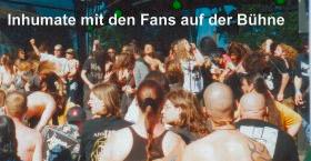 Mit den Franzosen Inhumate spielte dann die absolute Granate in Sachen Sickness. So kranke Gesellen, allen voran der Sänger sieht man nicht alle Tage. Im Infoheft zum Festival war über die Combo folgendes zu lesen: "Die französischen Knüppler haben was, was sonst kaum eine andere Band in der extremen Branche hat oder zur Schau trägt: Intelligenz." Klingt nett, mag ich auch nicht abstreiten, aber wenn man diese Beschreibung mit dem dargebotenem Auftritt vergleicht kommt man zu dem Schluss, dass das nicht Inhumate gewesen sein können. Die Jungs kamen schon im absolut bescheuerten Outfit auf die Bühne, knüppelten dann gut und anhörbar drauf los (die Musik war wirklich geil, so richtig grooviger flotter Death Metal) und fingen plötzlich an zu spinnen. Der Sänger lief wie irre geworden über die Bühne und heulte und schrie rum wie ein besessener, wobei der Rest der Band irgendwelche psychedelischen Sounds mit den Instrumenten fabrizierte. So weit, so gut, aber diese Passagen dauerten dann locker bis zu fünf Minuten. Sick! Zum Schluss bat man dann das Publikum, den letzten Song doch mitzusingen, was dann darin endete, daß so ca. 100 Mann auf der Bühne rumstanden und mit den völlig kranken Franzosen abfeierten. Muss man gesehen haben. (Thomas)