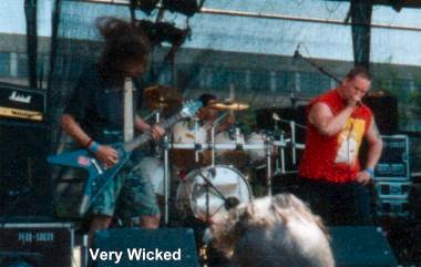So der erste Tag wäre geschafft und die ersten Metaller sind aus Ihrem Koma erwacht um Very Wicked aus Deutschland zu feiern. Very Wicked spielen eine Mischung aus Death Metal und Grind Core. Heute erst erkannten die Ordner das es so heiß war, dass man die pogende Menge mit Wasser etwas abkühlen musste, da es bestimmt so um die 28 Grad im Schatten und vor der Bühne, in der Sonne, so um die 35 Grad heiß war. Der Sänger der Kombo meinte in seinen Ansagen schlechte Witze machen zu müssen, was den Gig der Band etwas abwertete. Als nach einer dreiviertel Stunde und einer Zugabe, der Auftritt sein Ende nahm, war eine durchaus begabte aber am diesem Tage nicht überzeugende Band gegangen. (Willy)