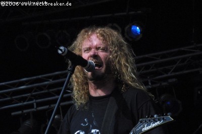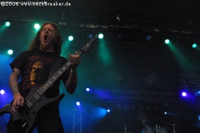 Allein der Einstieg mit dem Instrumental „Redneck Stomp“ war einmal mehr absolut genial und passend. Meister John Tardy war sichtlich begeistert ob der frenetischen Reaktionen und übertrug seine gute Laune auf das Publikum. Die Band war einmal mehr perfekt aufeinander eingespielt und brachte wohl den besten Gig des ganzen Festivals zu Stande. Egal ob Songs neueren Datums wie z.B. „Lockjaw“, „Insane“ oder alte Kultklassiker wie „Slowly we rot“, hier klang alles wie aus einem Guss und wusste zu überzeugen. Unglaublich war auch, mit welcher Leichtigkeit Master Allen West seine Mörder-Riffs ins Publikum schleuderte. Cool und lässig mit Kippe auf dem Zahn und mit einer extremen Coolness wirkte er schon fast ein wenig abwesend. Das nennt man dann wohl den „Jack Owen-Effekt“ ;-)