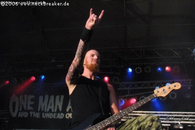 Unter dem Banner ONE MAN ARMY AND THE UNDEAD QUARTET hat sich Anfang 2006 mit Sänger Johan Lindstrand das erste Mitglied der aufgelösten The Crown auf der metallischen Bühne zurückgemeldet. Mit dem geilen Debüt „21st Century Killing Machine“ im Gepäck beackerten die fünf Schweden diesen Sommer fleißig die deutschen Festivalbühnen, und zum Abschluss gaben sie auch auf dem UFTG alles. Der midtempolastige Death Metal brachte etliche Köpfe im zahlreich erschienenden Publikum zum Rotieren, und besonders das Charisma vom Kotletten-König und „Satan from Hell“ Johan war ein Highlight. Mit dem Songmaterial des Debüts wie „Devil On The Red Carpet“, „When Hatred Comes To Life“ und „So Grim So True So Real“ kann man zudem eh nichts falsch machen – auch wenn natürlich der ein oder andere The Crown-Klassiker eine gern gesehene Überraschung gewesen wäre. So oder so, OMAATUQ war auf jeden Fall ein Highlight, und man kann nur hoffen, dass die Untoten-Armee so weitermacht. (Kai)