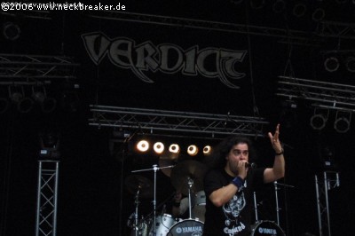 Wie mir berichtet wurde, war der erste Auftritt von VERDICT auf dem UFTG vor einigen Jahren in erster Linie von einem unsäglichen Dreckswetter geprägt – diesmal gab es diesbezüglich nix zu meckern, strahlender Sonnenschein und kein einziger Regentropfen boten das ideale Rahmenprogramm für eine halbe Stunde old schooligen Thrash Metal. Und die Nordbayern (oder Franken? Ich will mir da keine Feinde machen…) gaben dann auch ordentlich Gas. Die sympathische Ausstrahlung der Jungs um Fronter Daniel, das arschtighte Zusammenspiel und nicht zuletzt das überzeugende Songmaterial der beiden Scheiben „Reflections Of Pain“ und „Generation: Genocide“ – allen voran der Ohrwurm „Sick Society“ – konnten wahrscheinlich die meisten der leider noch nicht allzu zahlreich erschienenen Zuschauer überzeugen. Mich auf jeden Fall, und so war der Auftritt von VERDICT schon einmal ein erstes Highlight des zweiten Festival-Tages – nicht nur wegen des Wetters… (Kai)