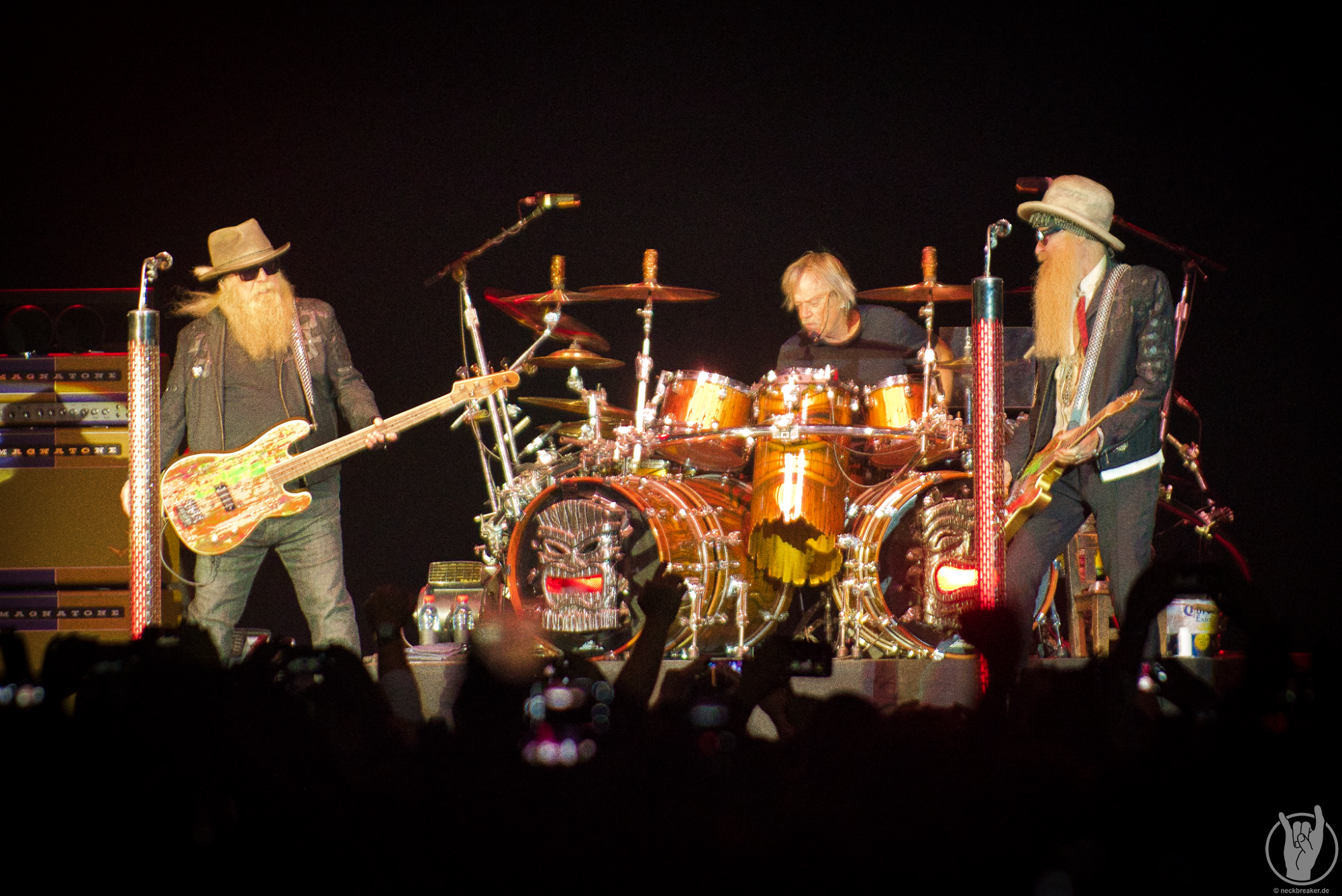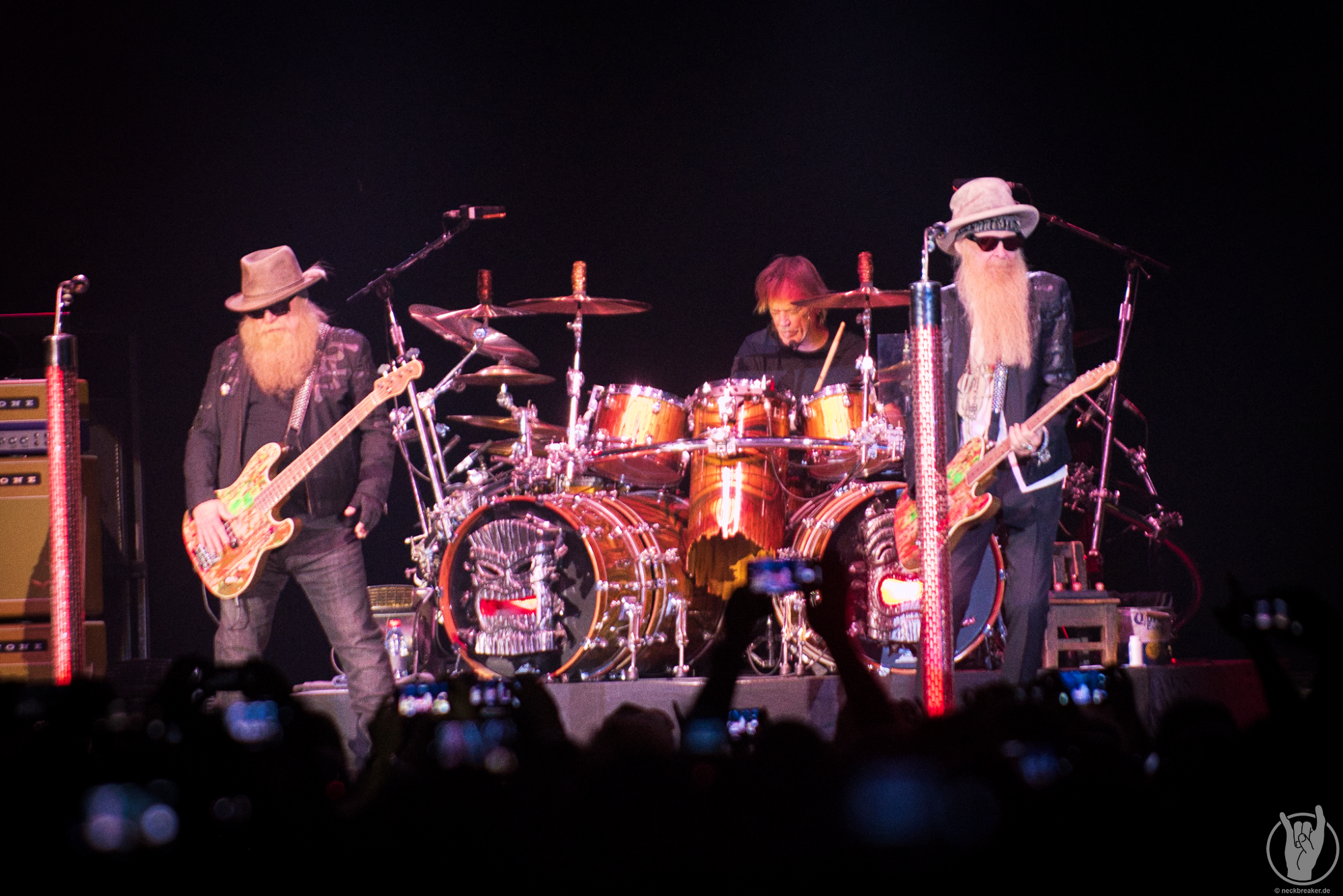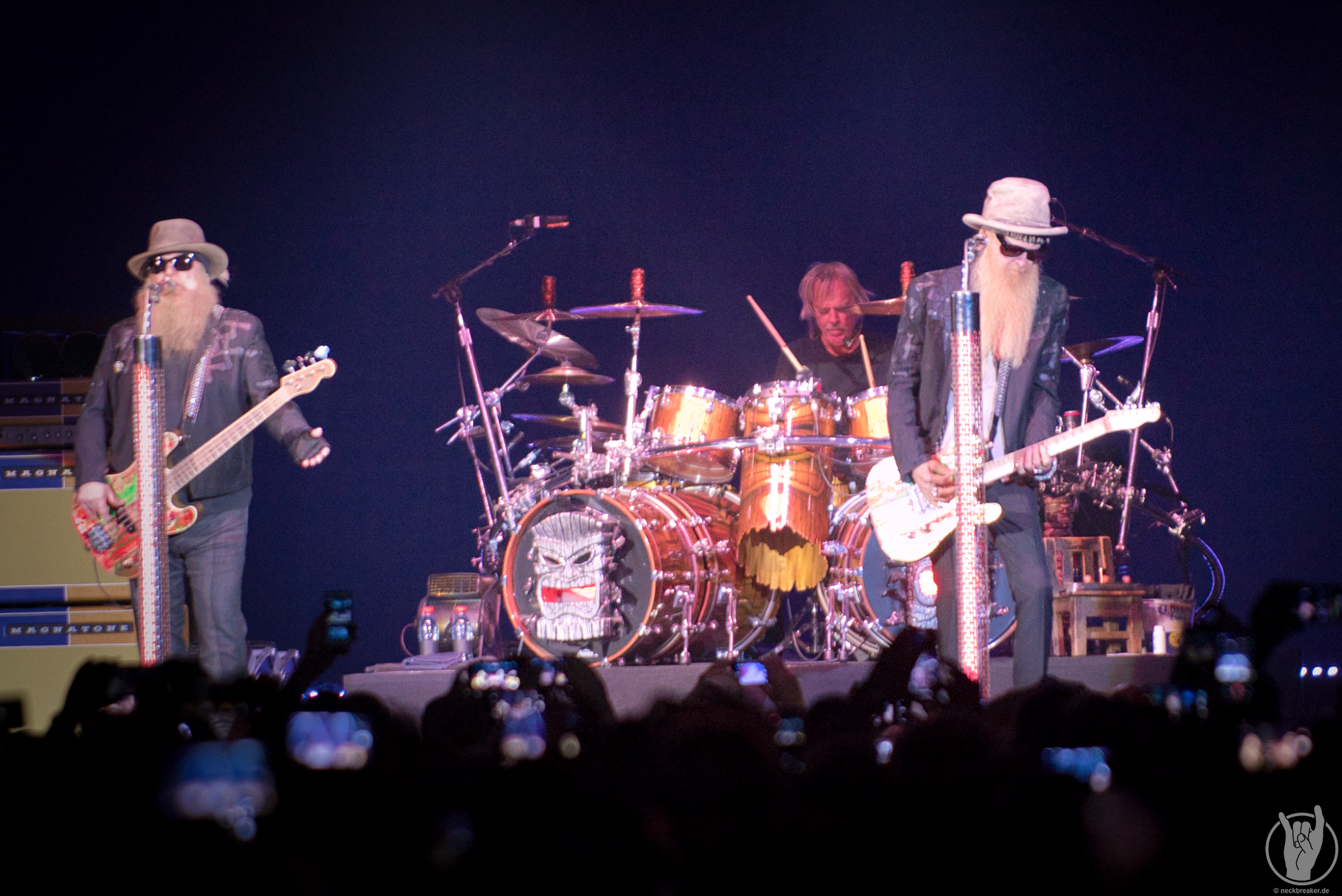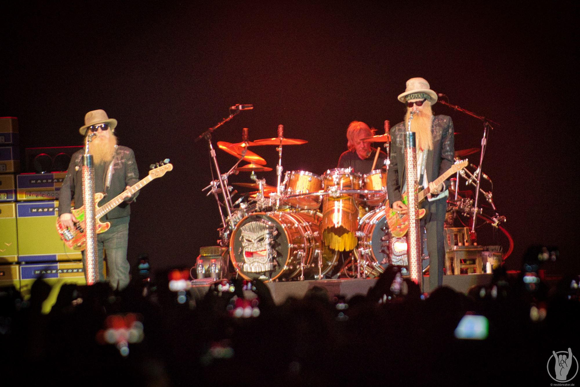 Und das völlig zu Recht, denn die Herren bieten noch immer das, was sie bereits 1986 boten (Wie mir Kollege Alex vor dem Konzert noch erzählt). Älter geworden sind sie dennoch, doch weder Billy Gibbons noch Dusty Hill sieht man das Alter wirklich an. Was mitunter natürlich an den Sonnenbrillen, Hüten und Bärten liegen mag. Auch Schlagzeuger Frank Beard, ohne Bart, sitzt wie gewohnt auf dem heißen Stuhl und erledigt cool mit Zigarette seinen Job.
