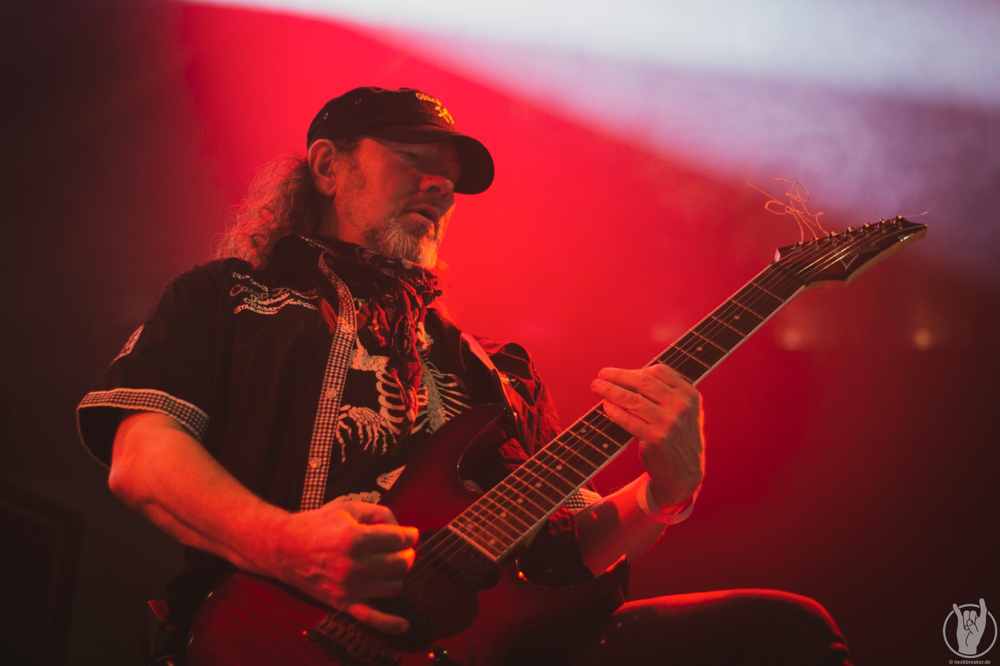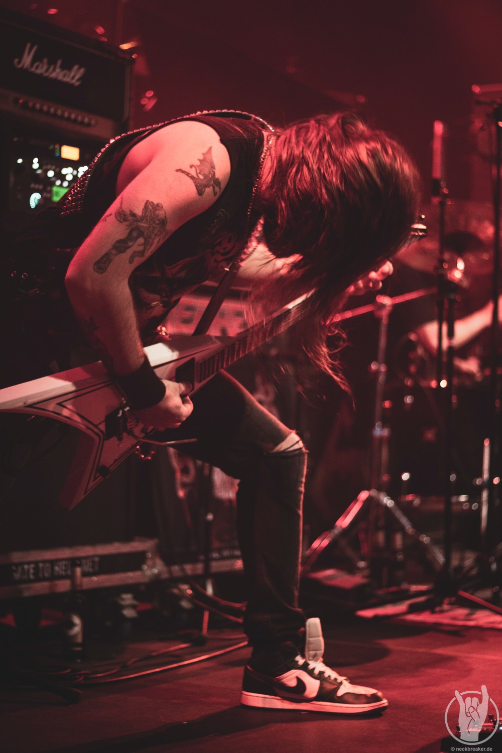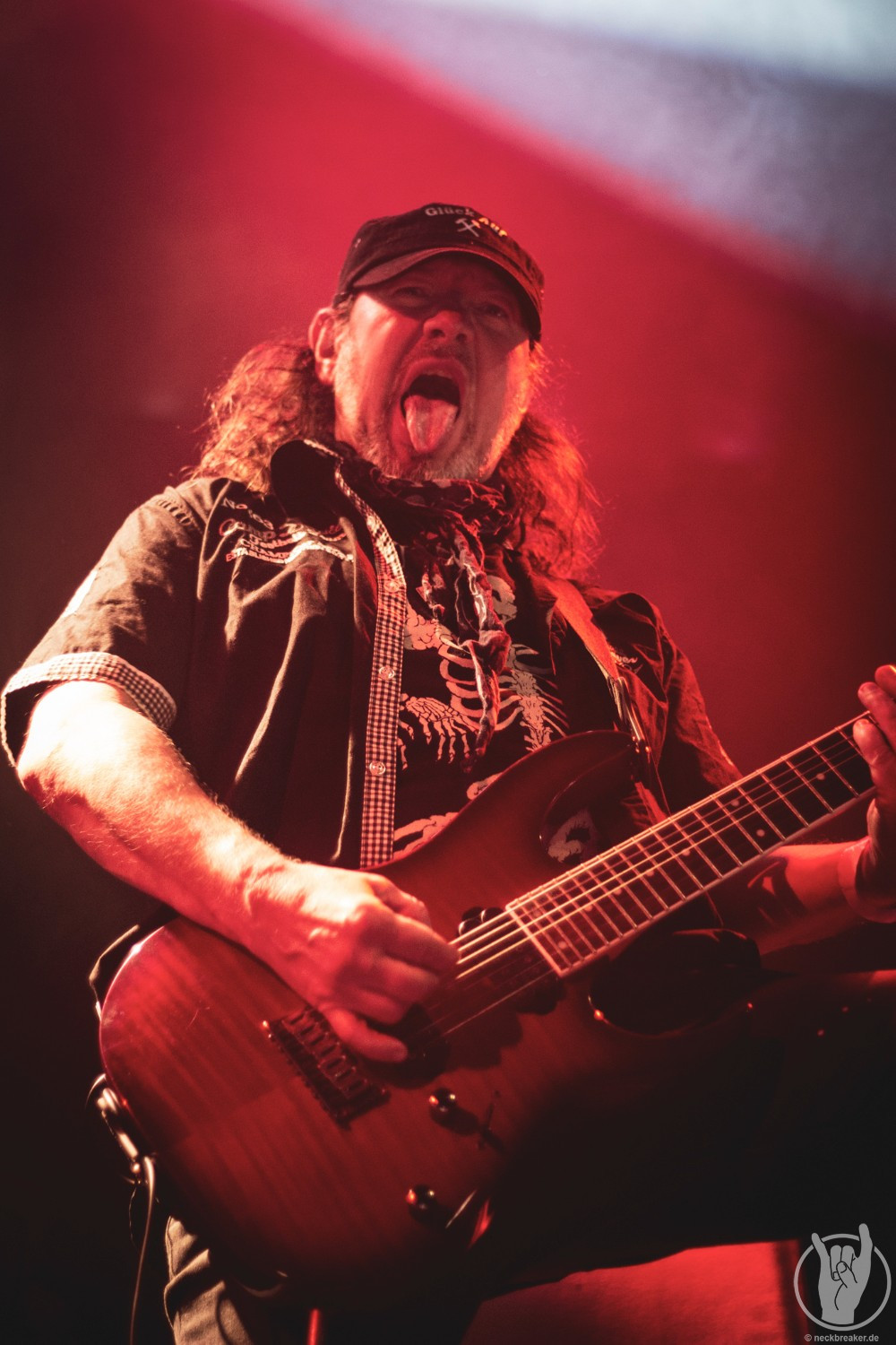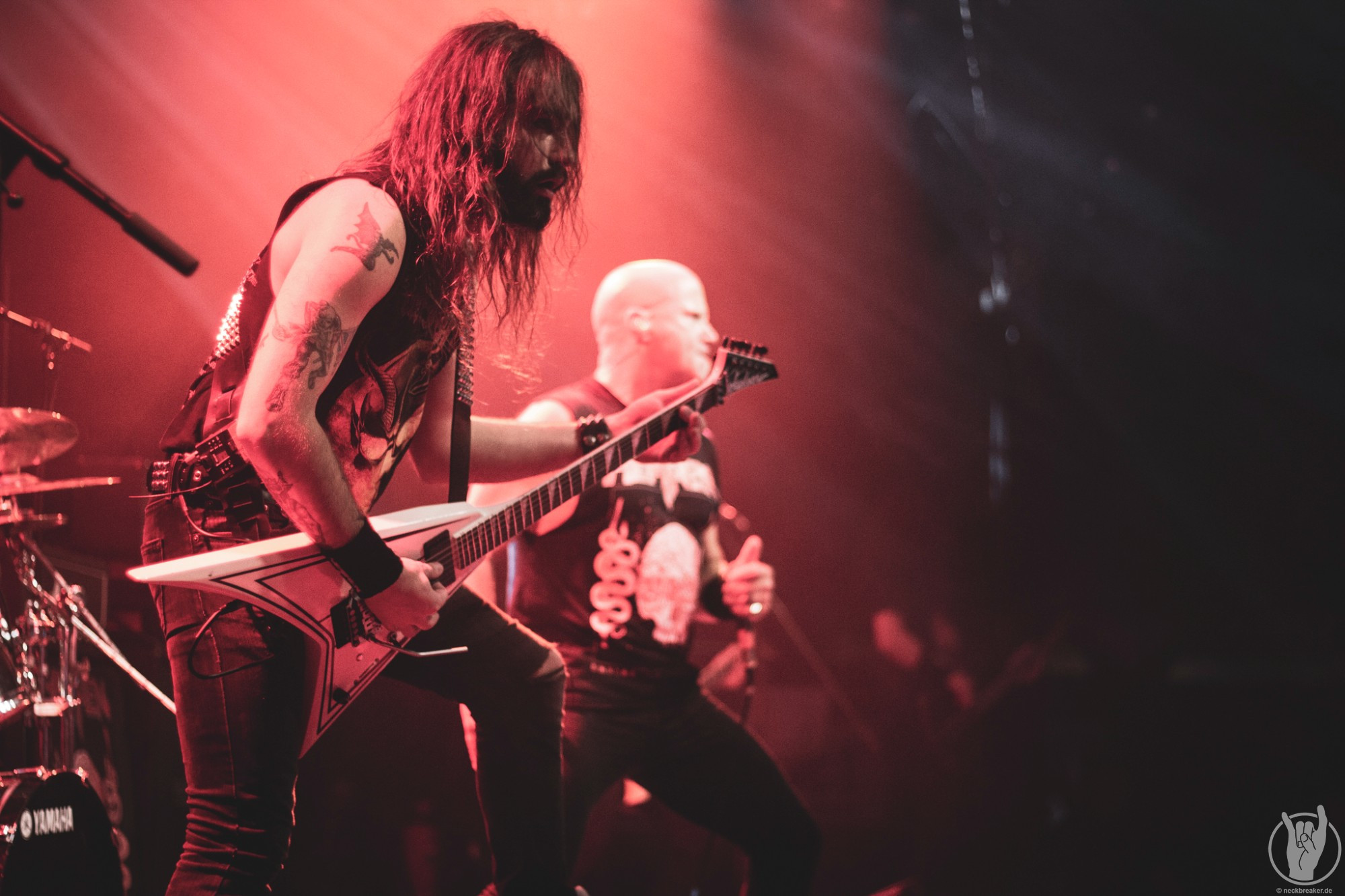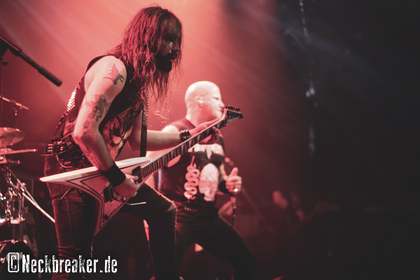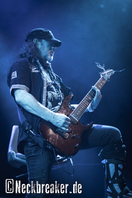 Wie gewohnt verschwand Blitz zwischen den Gesangparts eilig hinter die Marshall-Türme, vermutlich um ein paar Züge an der Zigarette zu tätigen. Oder sollte er schon in dem Alter sein, in dem er regelmäßig an den Sauerstoff muss? Niemals!