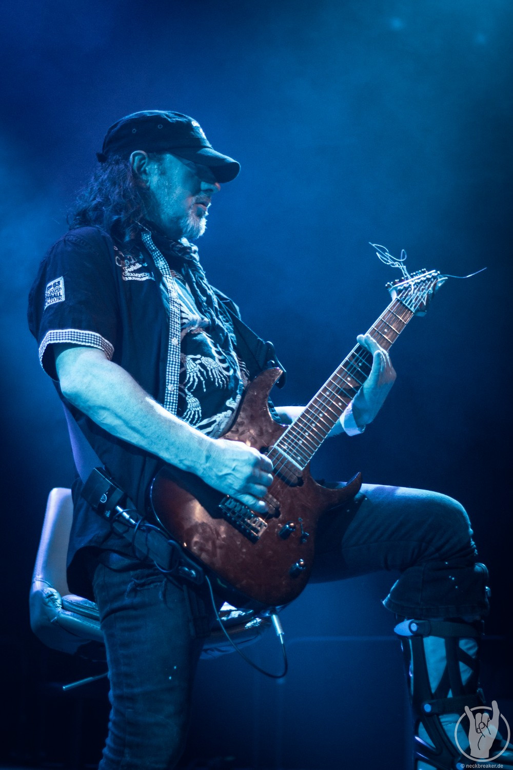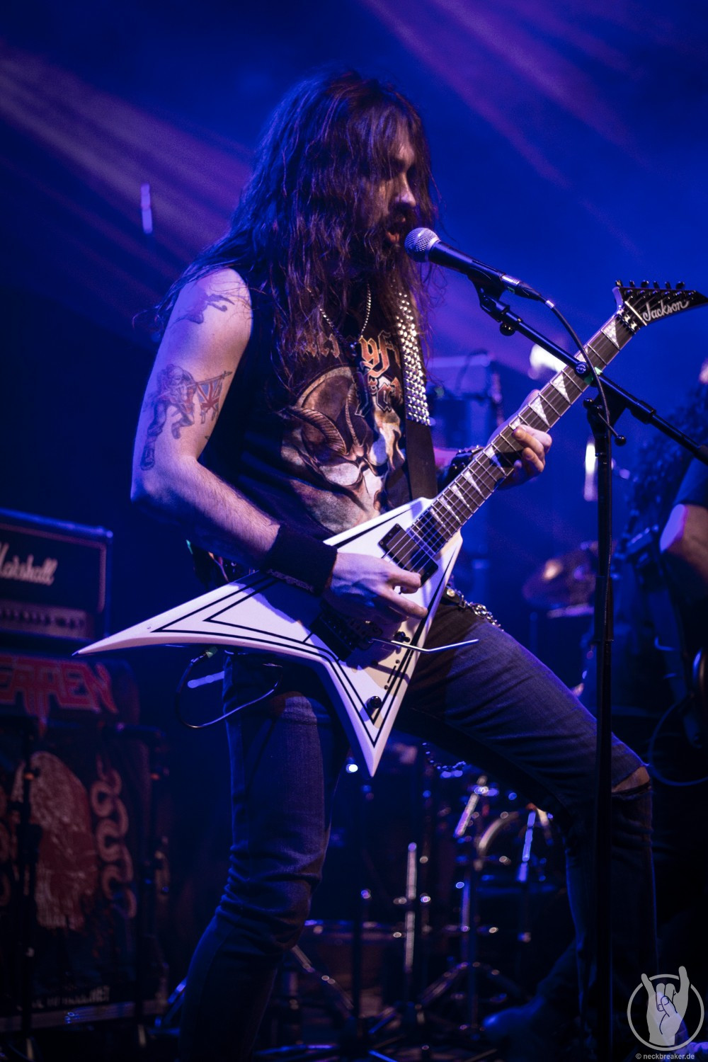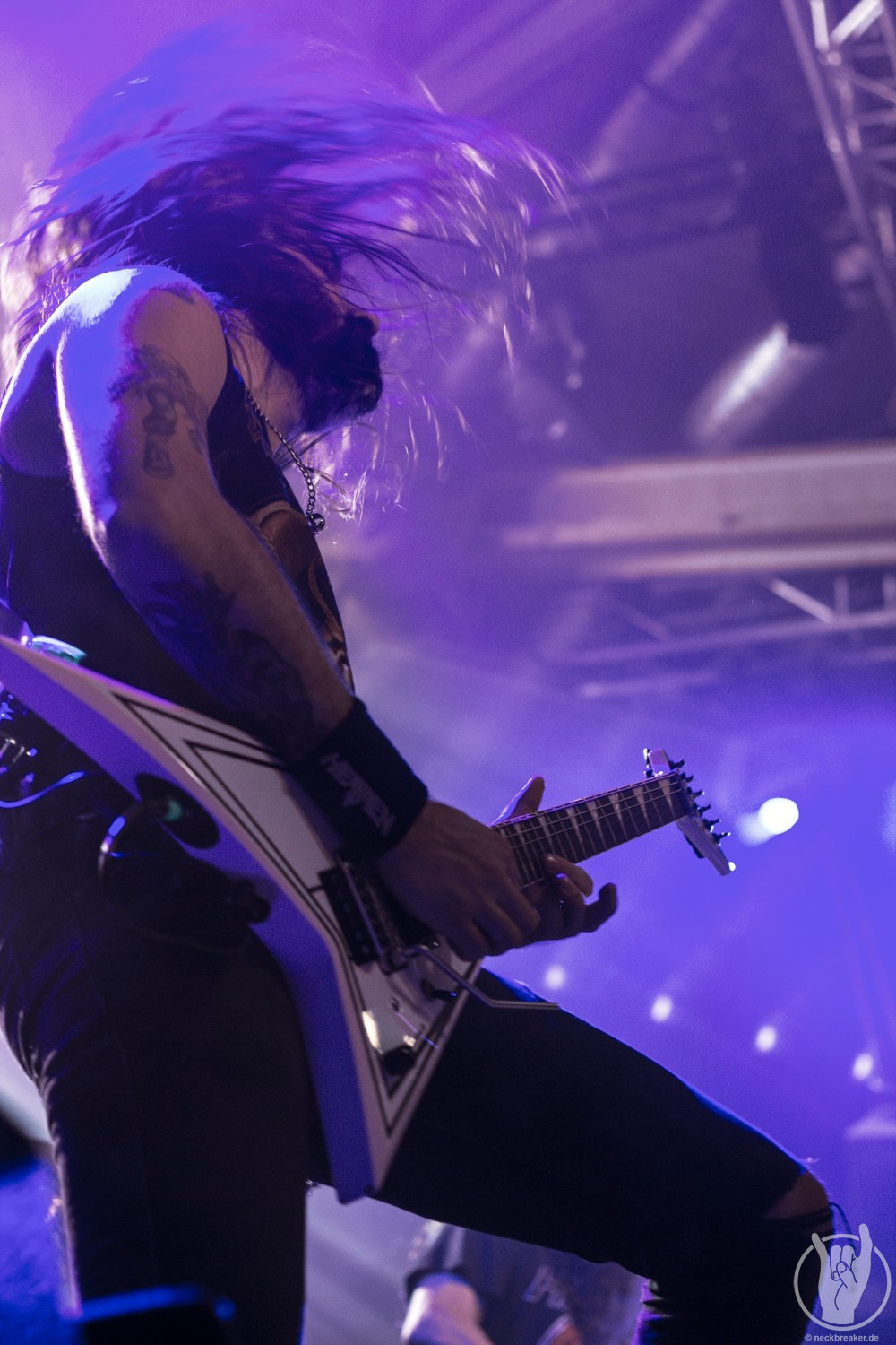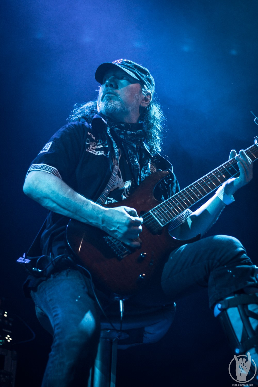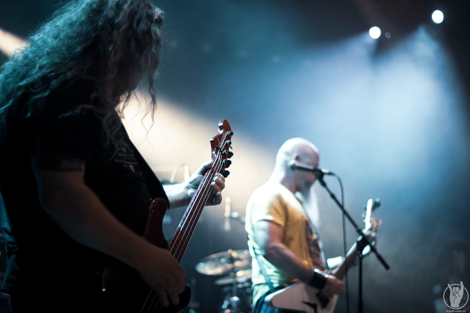Wie gewohnt verschwand Blitz zwischen den Gesangparts eilig hinter die Marshall-Türme, vermutlich um ein paar Züge an der Zigarette zu tätigen. Oder sollte er schon in dem Alter sein, in dem er regelmäßig an den Sauerstoff muss? Niemals!