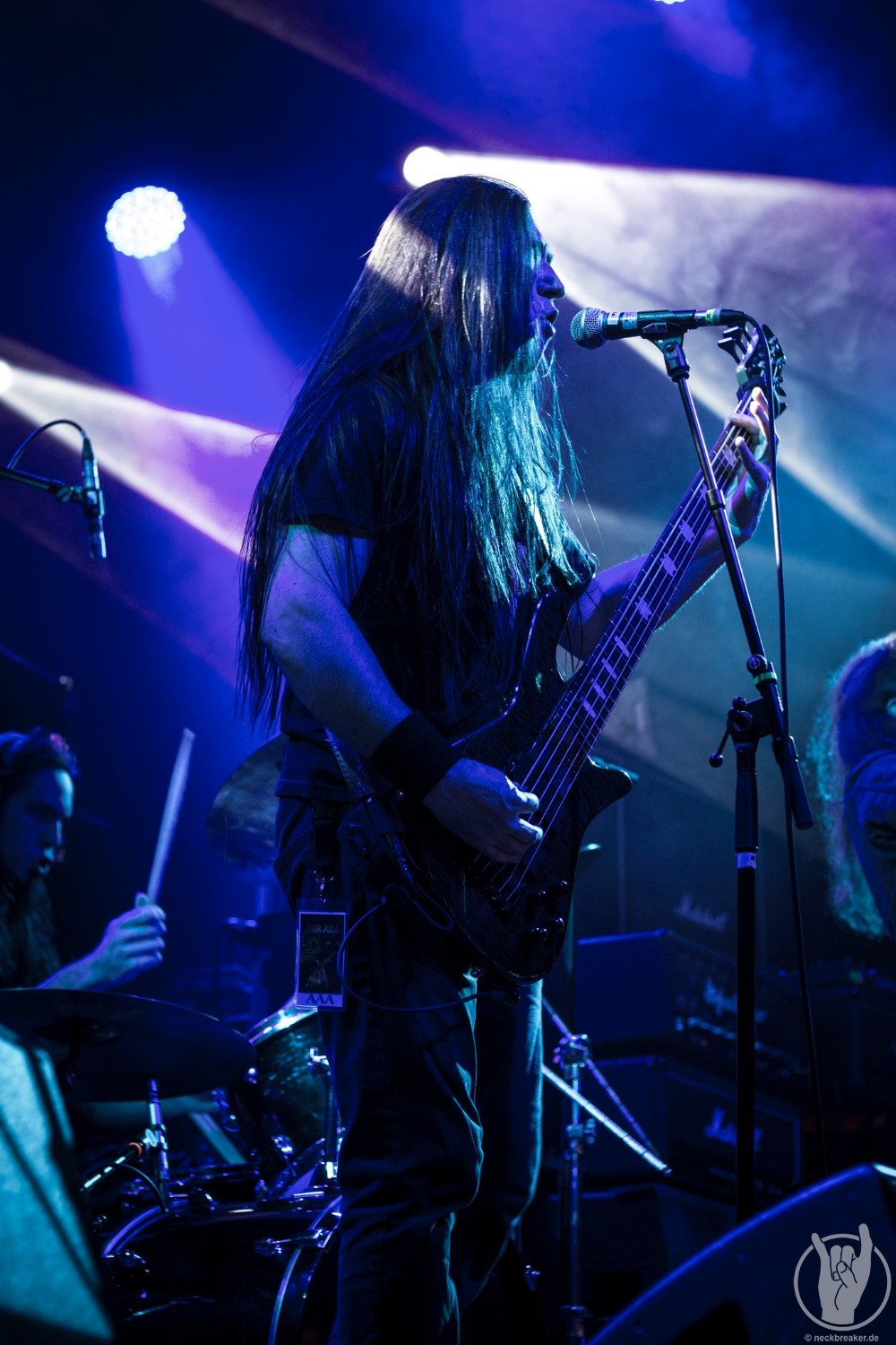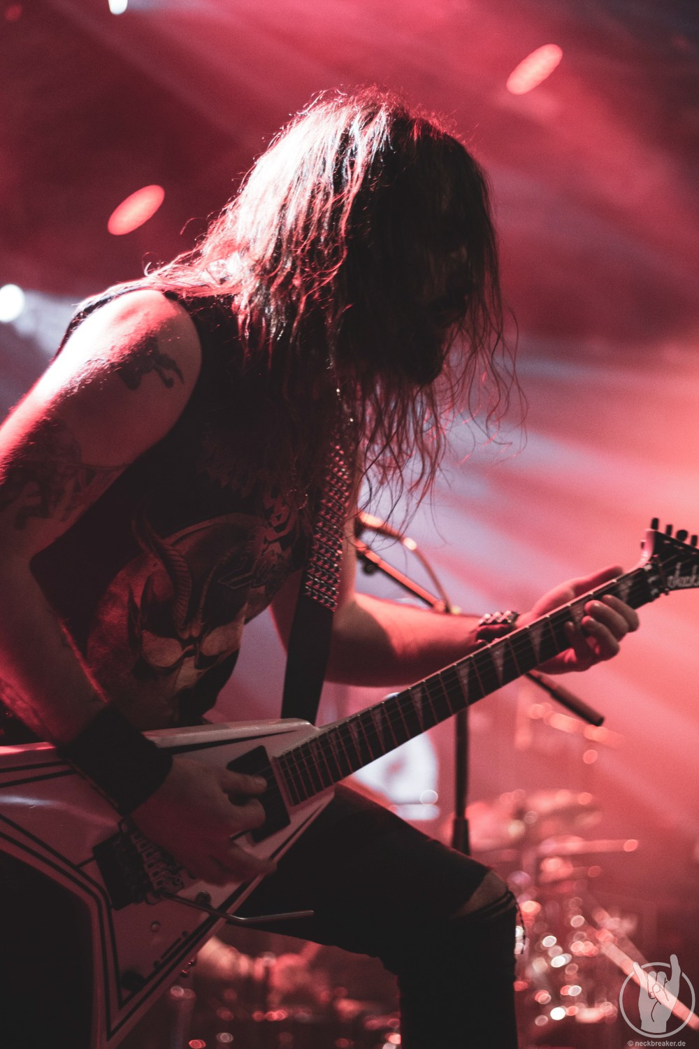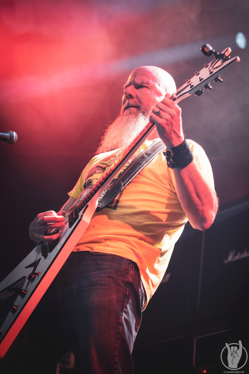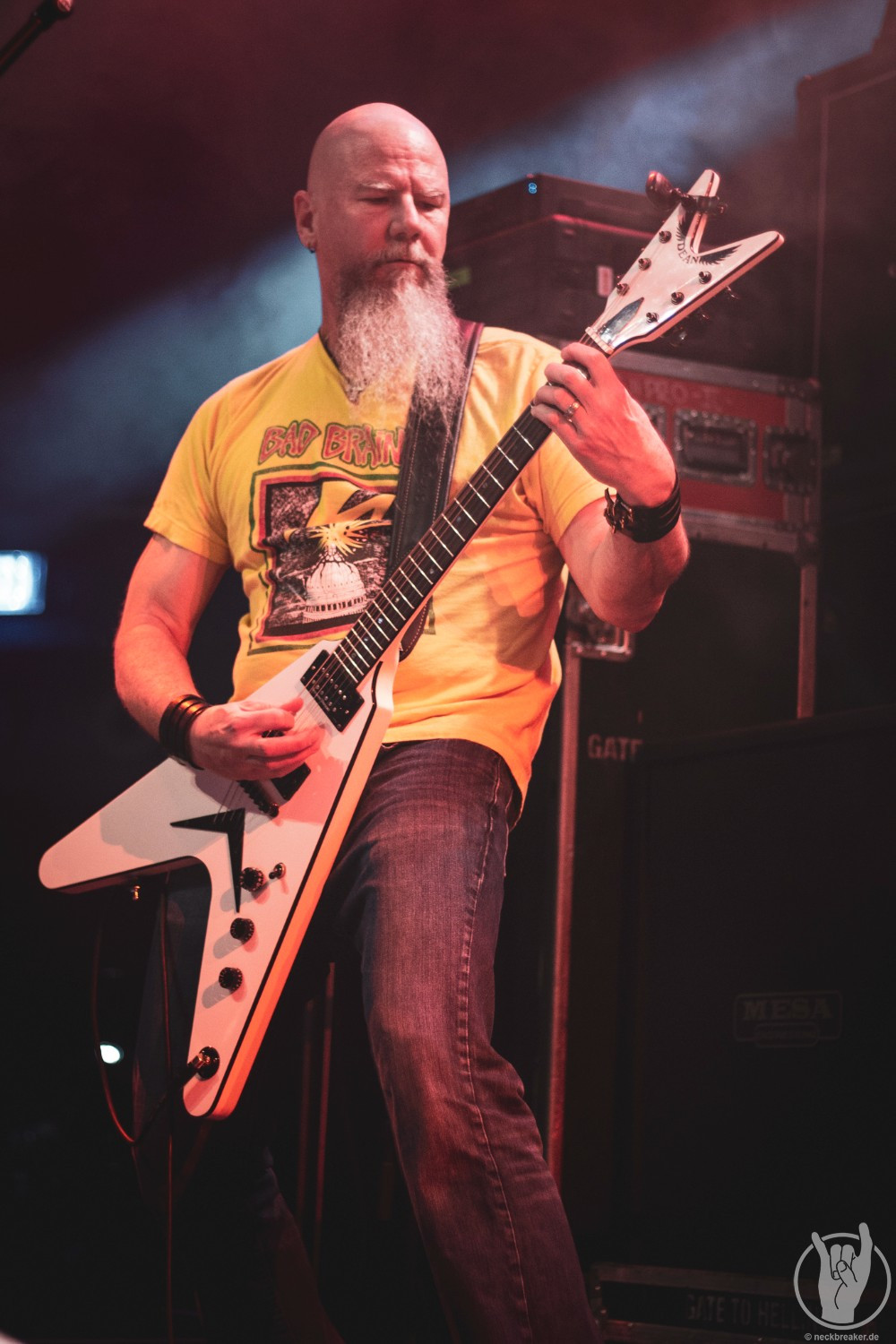 Wie gewohnt verschwand Blitz zwischen den Gesangparts eilig hinter die Marshall-Türme, vermutlich um ein paar Züge an der Zigarette zu tätigen. Oder sollte er schon in dem Alter sein, in dem er regelmäßig an den Sauerstoff muss? Niemals!