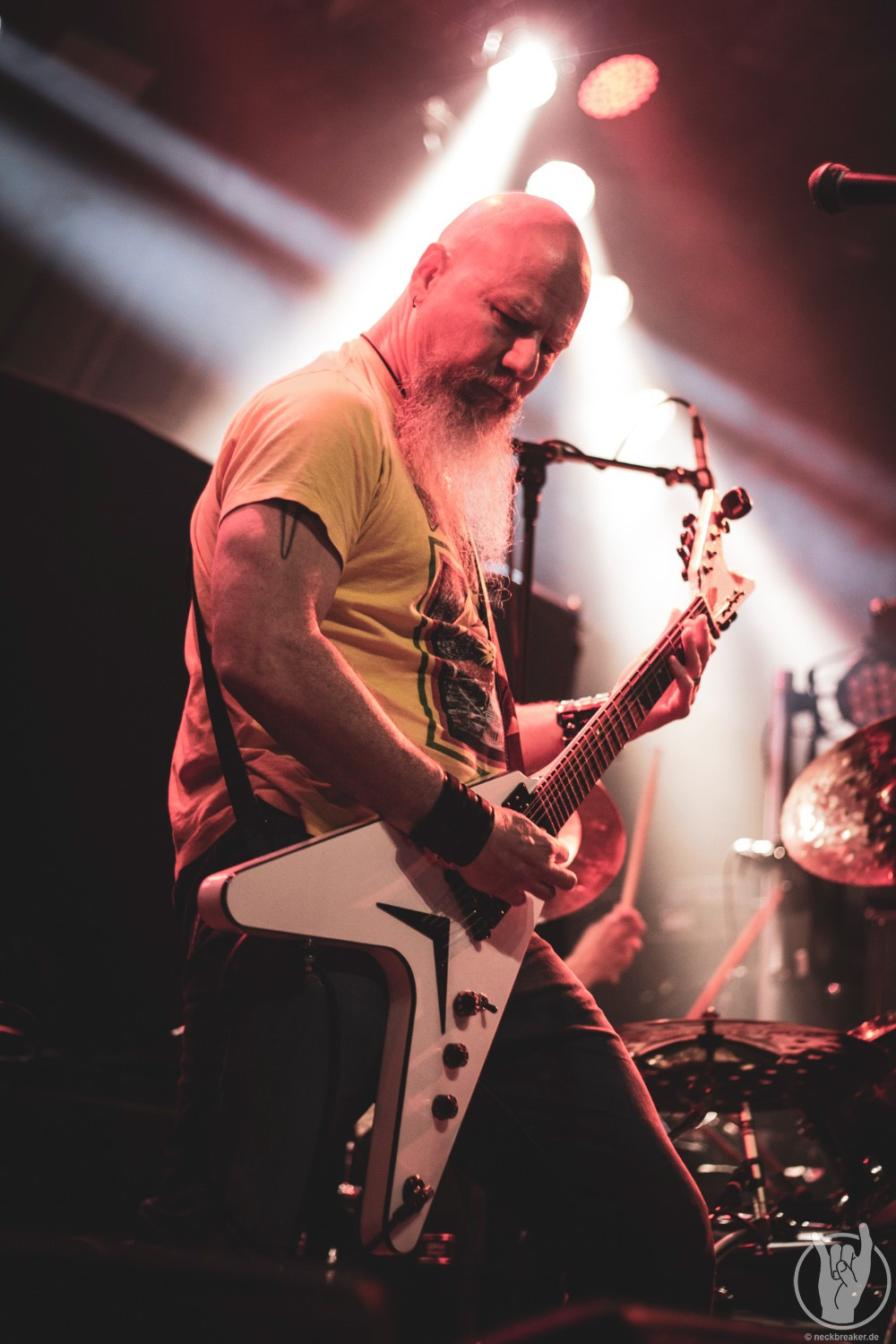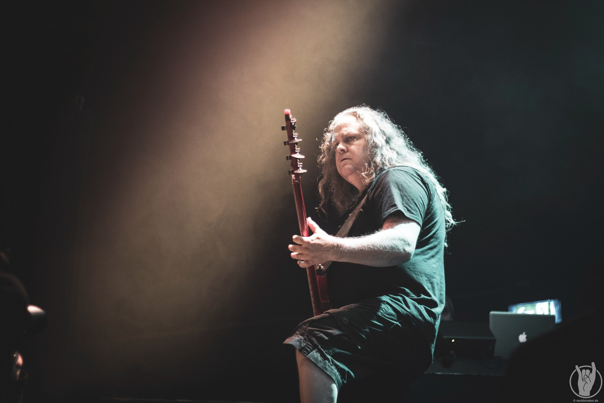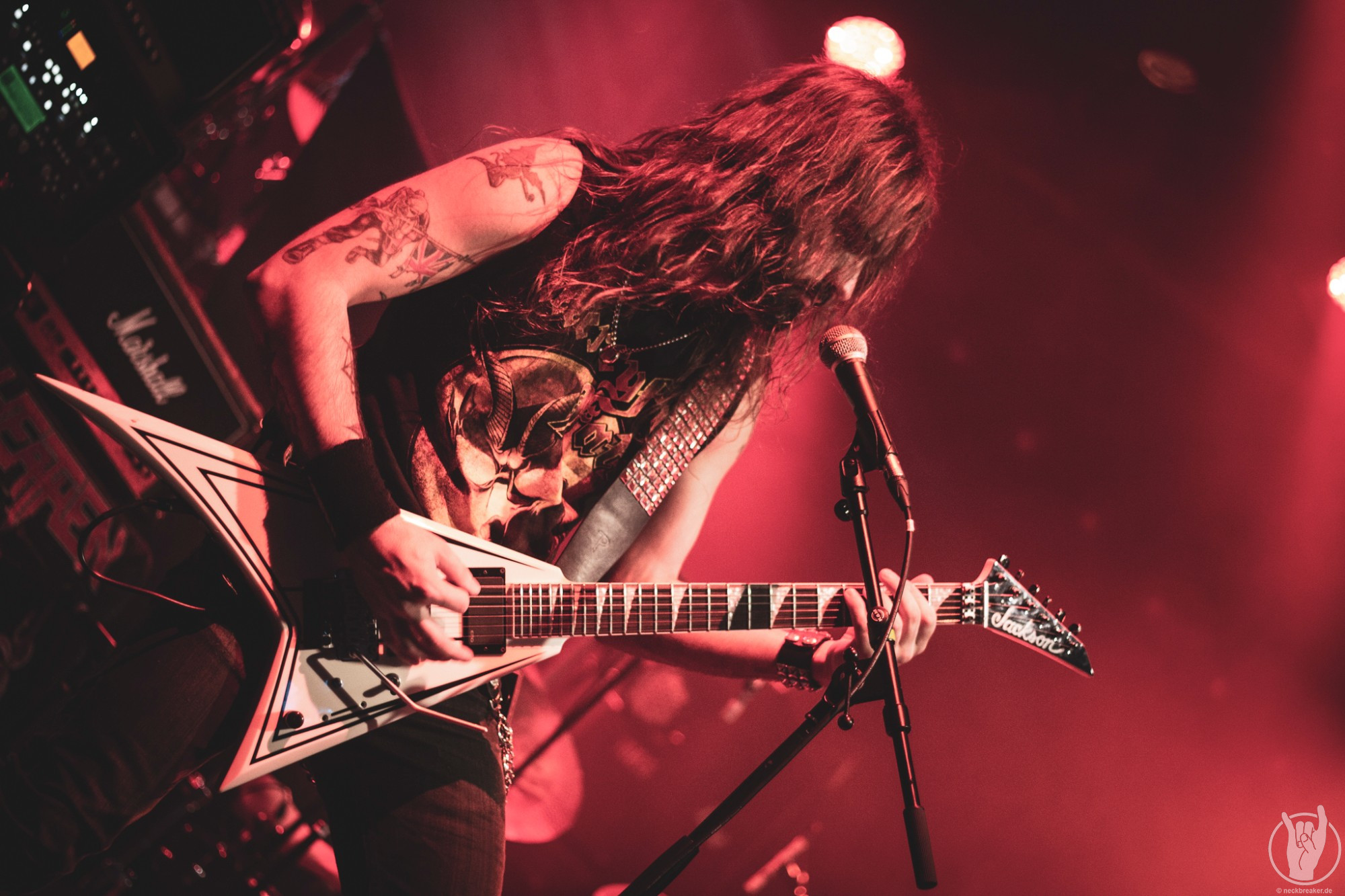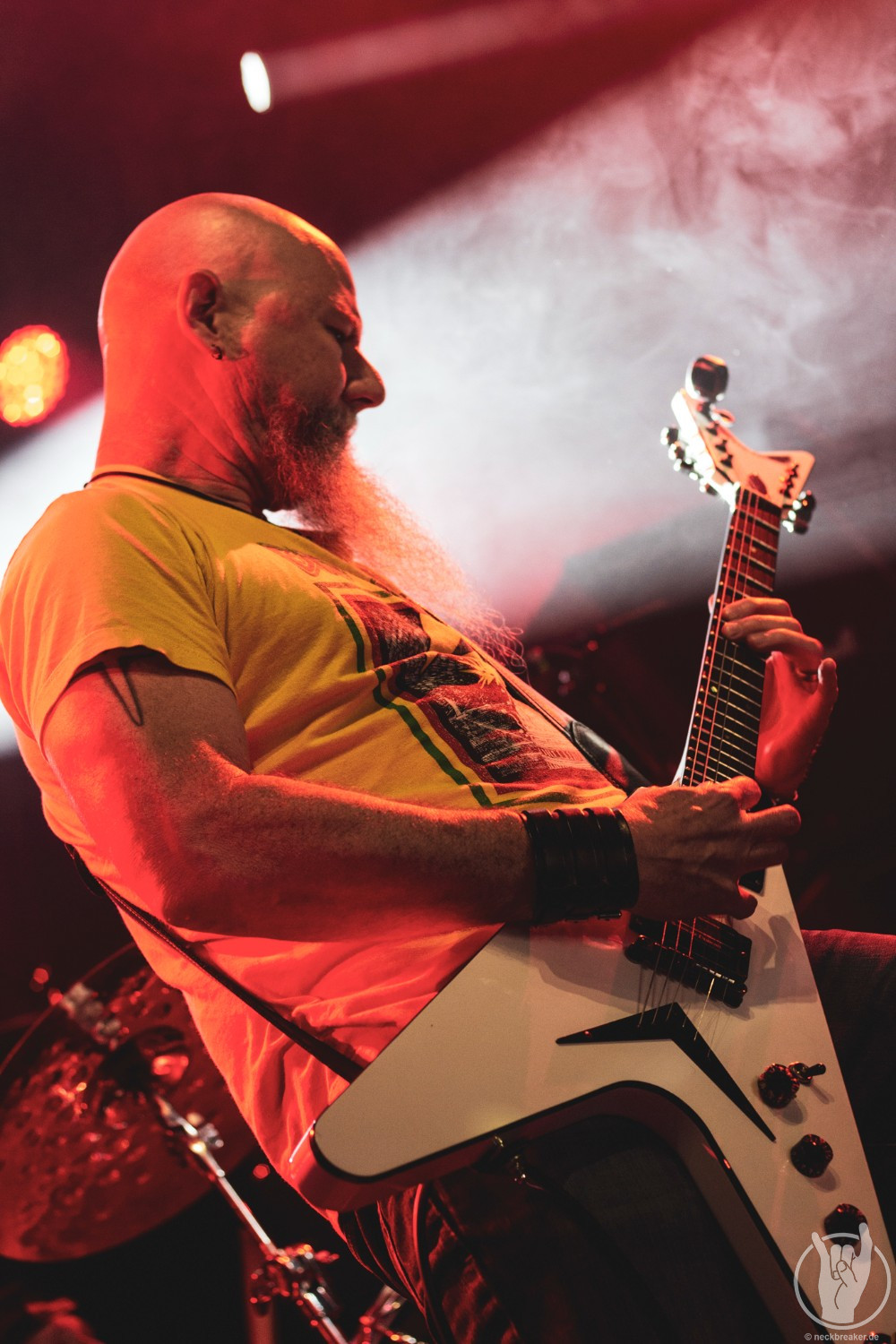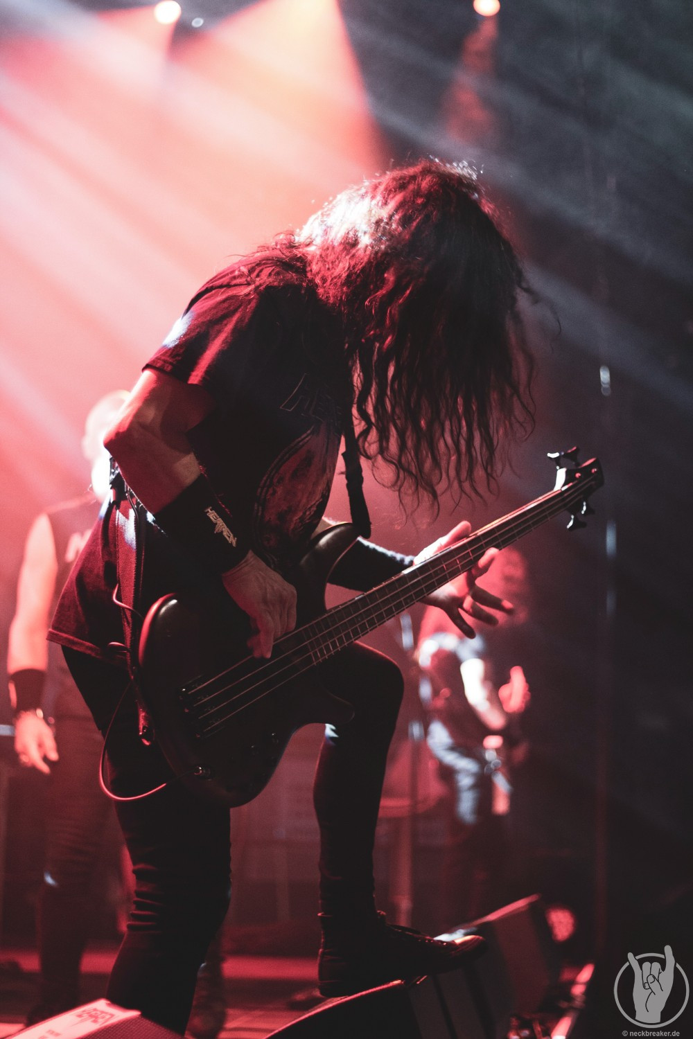 Wie gewohnt verschwand Blitz zwischen den Gesangparts eilig hinter die Marshall-Türme, vermutlich um ein paar Züge an der Zigarette zu tätigen. Oder sollte er schon in dem Alter sein, in dem er regelmäßig an den Sauerstoff muss? Niemals!