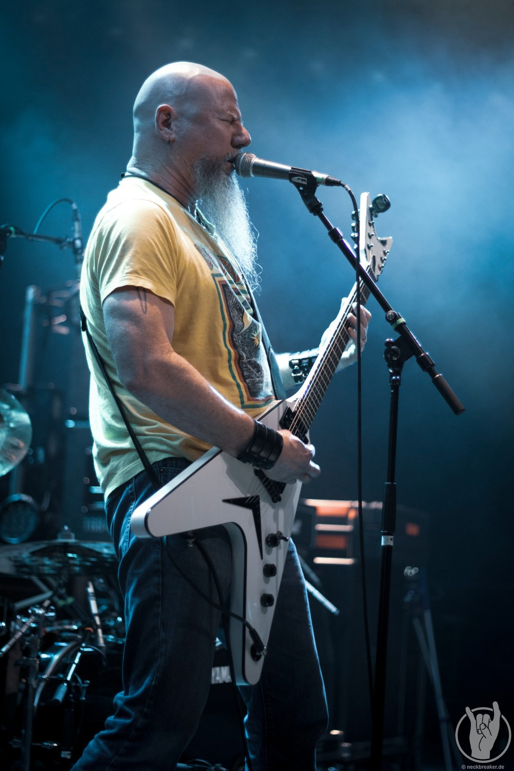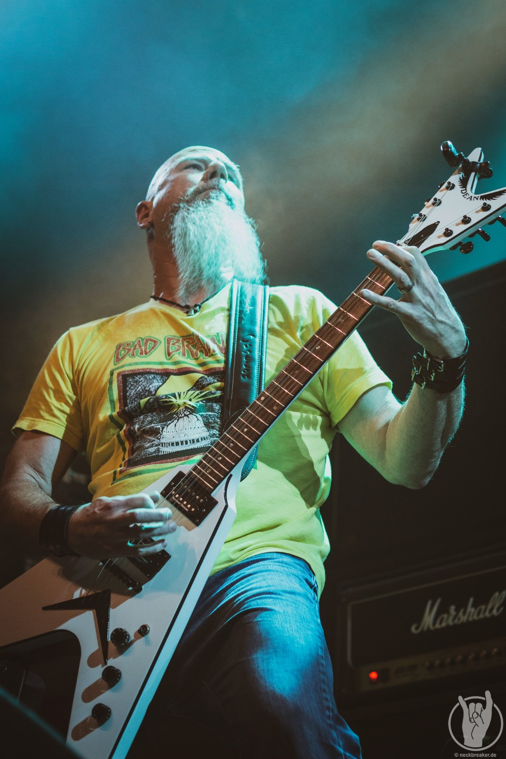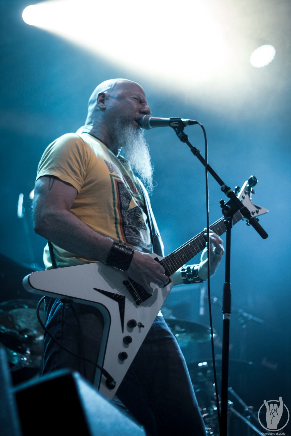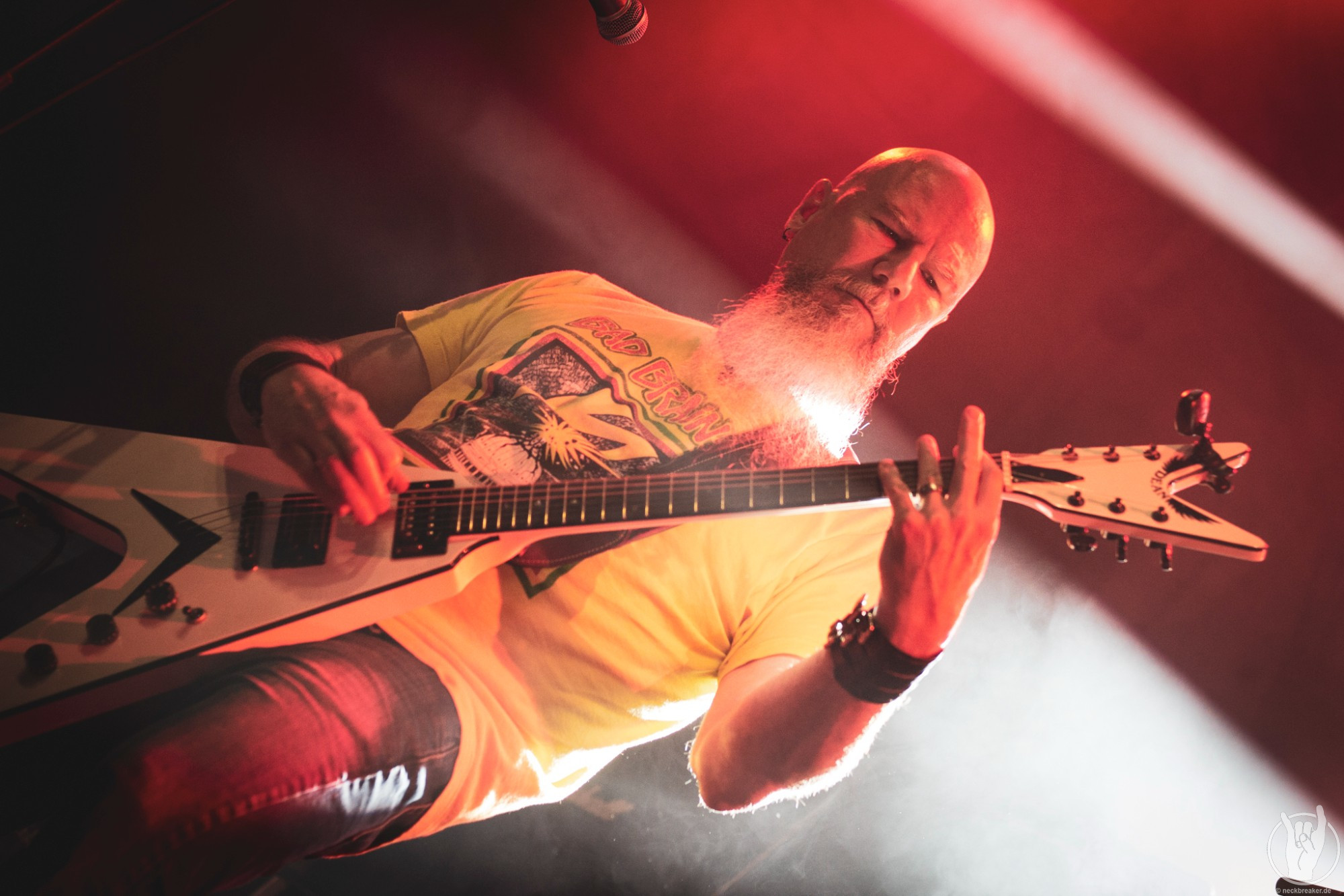 Wie gewohnt verschwand Blitz zwischen den Gesangparts eilig hinter die Marshall-Türme, vermutlich um ein paar Züge an der Zigarette zu tätigen. Oder sollte er schon in dem Alter sein, in dem er regelmäßig an den Sauerstoff muss? Niemals!