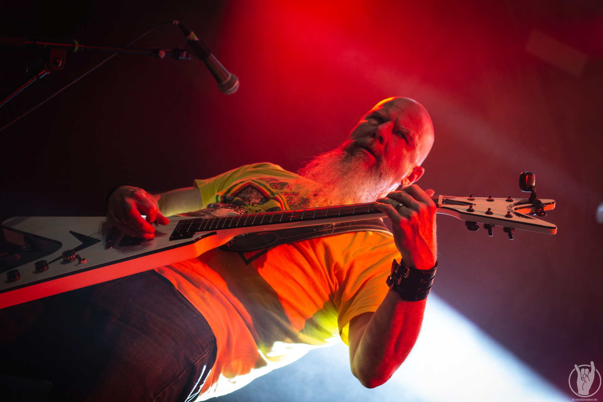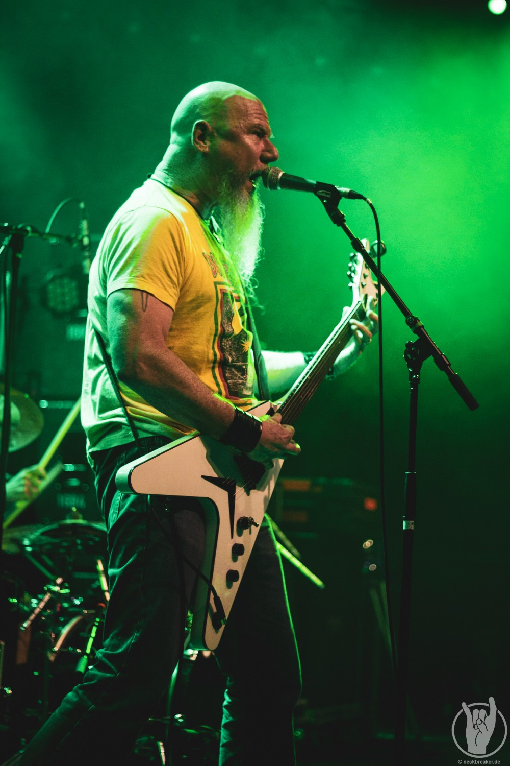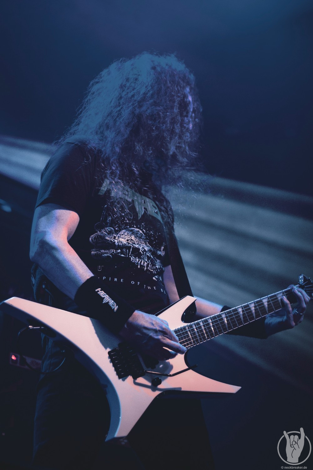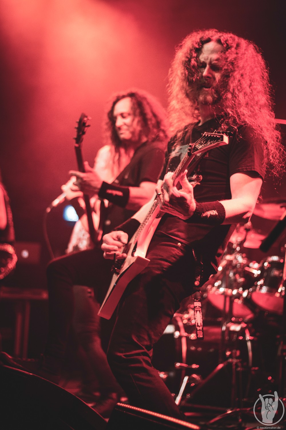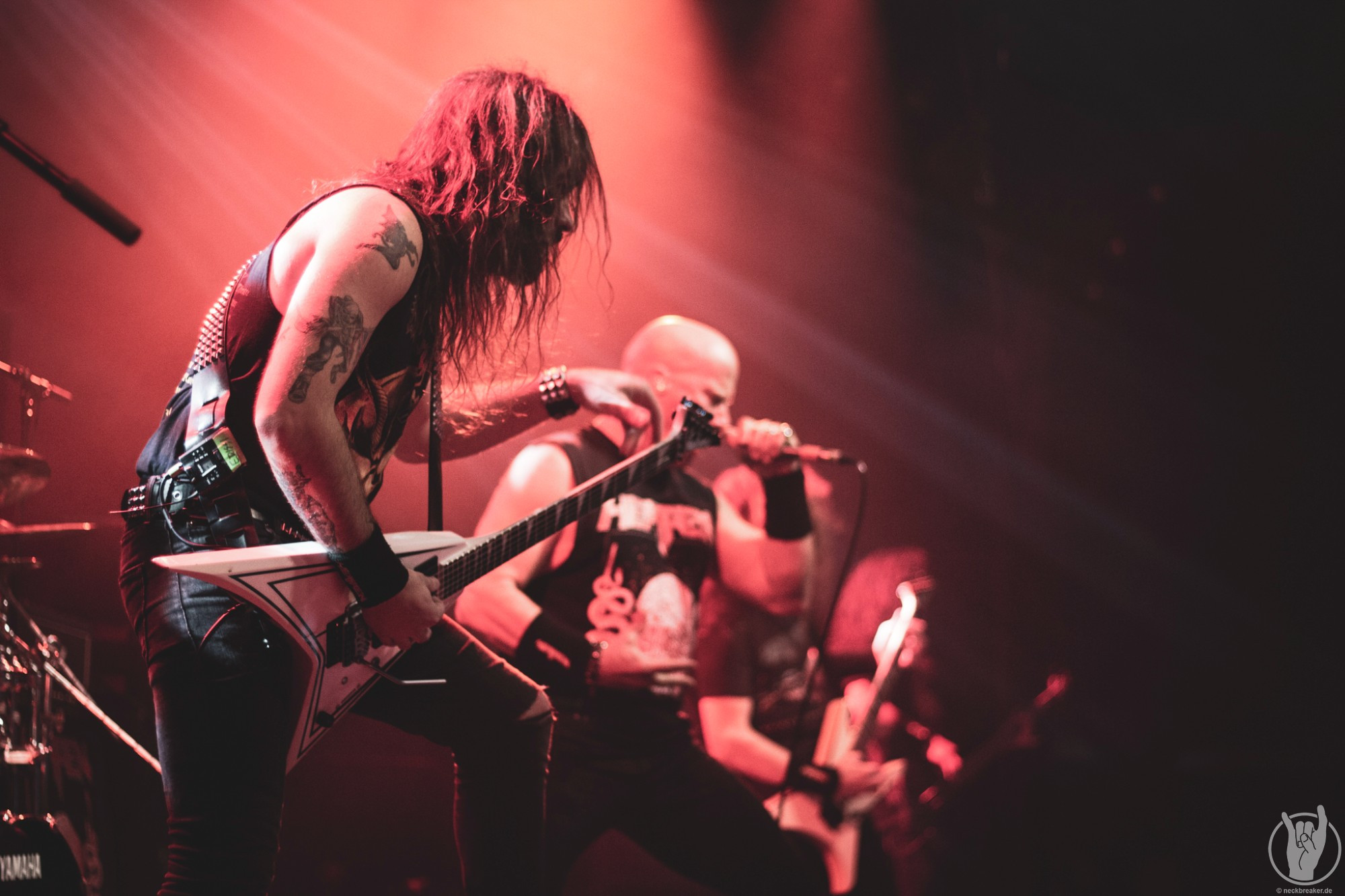 Passend zum neuen Album „Scorched“ war nicht nur das Backdrop und die Bassdrumfelle mit dem neuen Look bedacht, sondern auch der Opener. Direkt brach eine gewaltige Welle vor der Bühne los und die Leute waren nicht mehr zu halten. Wenn auch auf der Bühne bewegungsmäßig wenig los war, so ging es davor mächtig ab. Die anwesenden Leute des Fanclubs SKULLCRUSHERS hatten sogar einen eigenen Bereich in der Garage eingenommen und zelebrierten den Abend entsprechend.