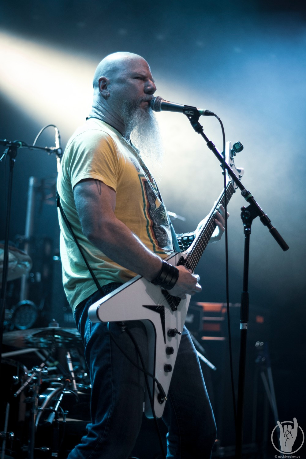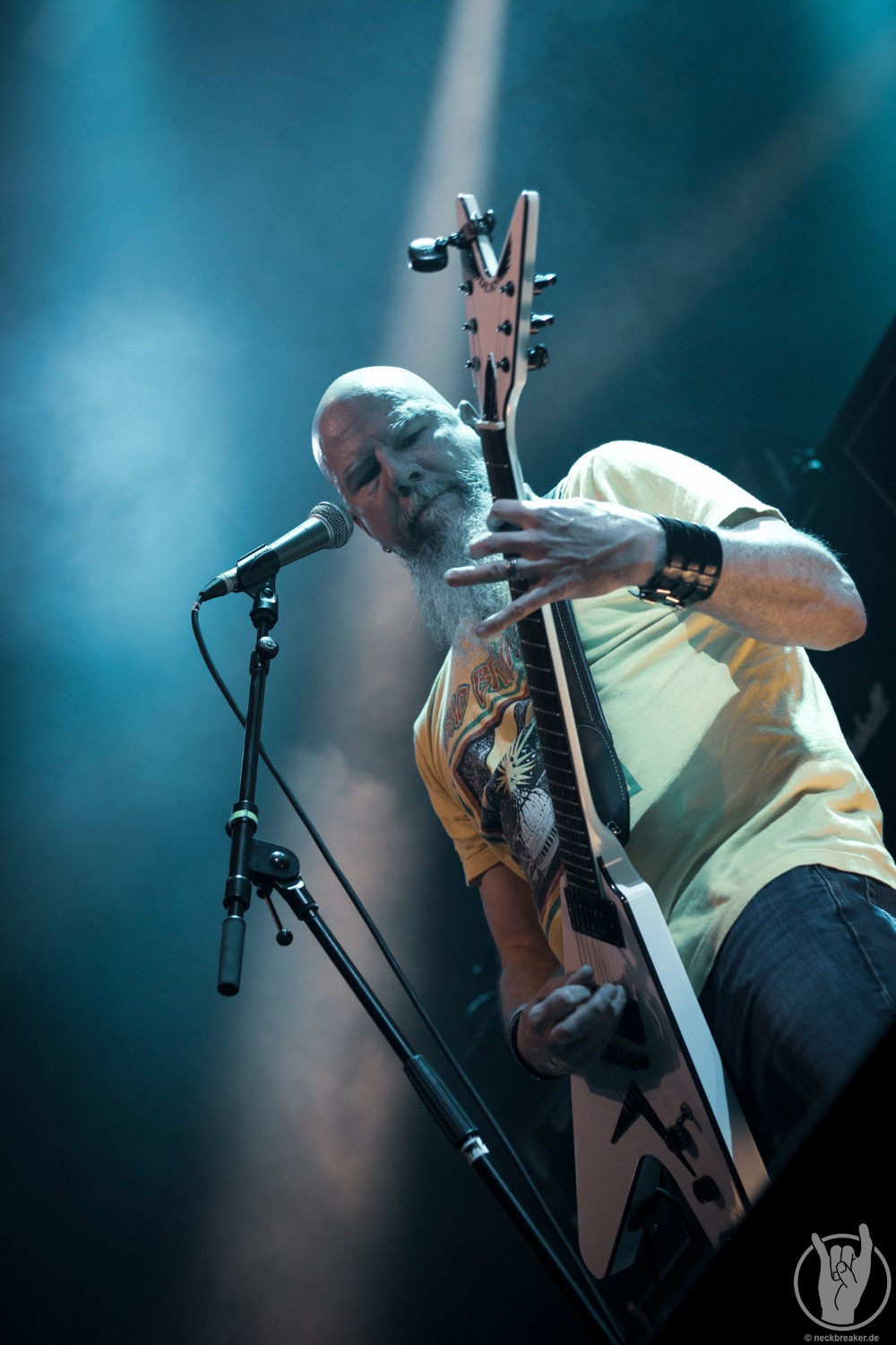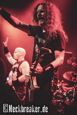 Nun ist es Zeit für den Headliner des Abends, dem auch ich am meisten nacheiferte. OVERKILL sind live immer wieder eine Bank, daher ging ich mal nicht von einer Enttäuschung aus. Schon rein optisch sind die fünf Herren ja altersmäßig auch nicht stehengeblieben, somit war ich vor allem auf Bobbys Performance gespannt. Die großen Gesten und beeindruckenden Darbietungen des drahtigen Fronters waren immer wieder beeindruckend. Dazu die Ausnahmestimme, die hoffentlich auch nicht zwischenzeitlich gelitten hat.