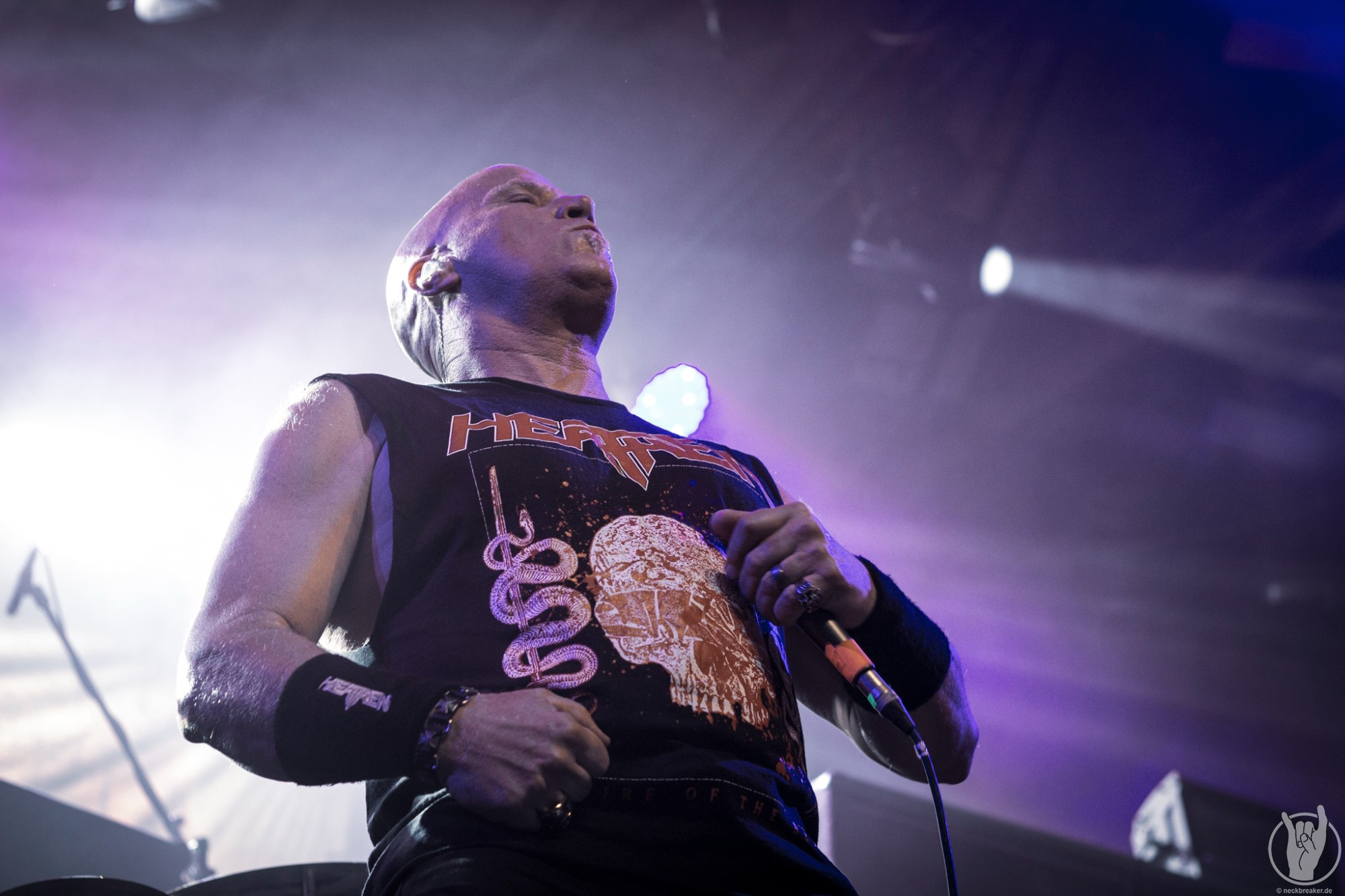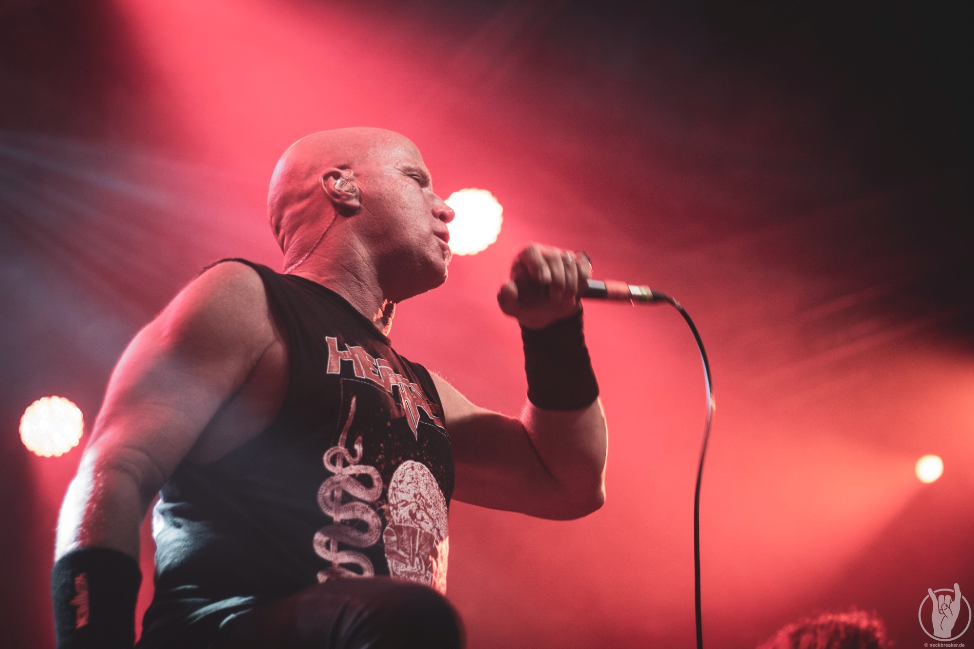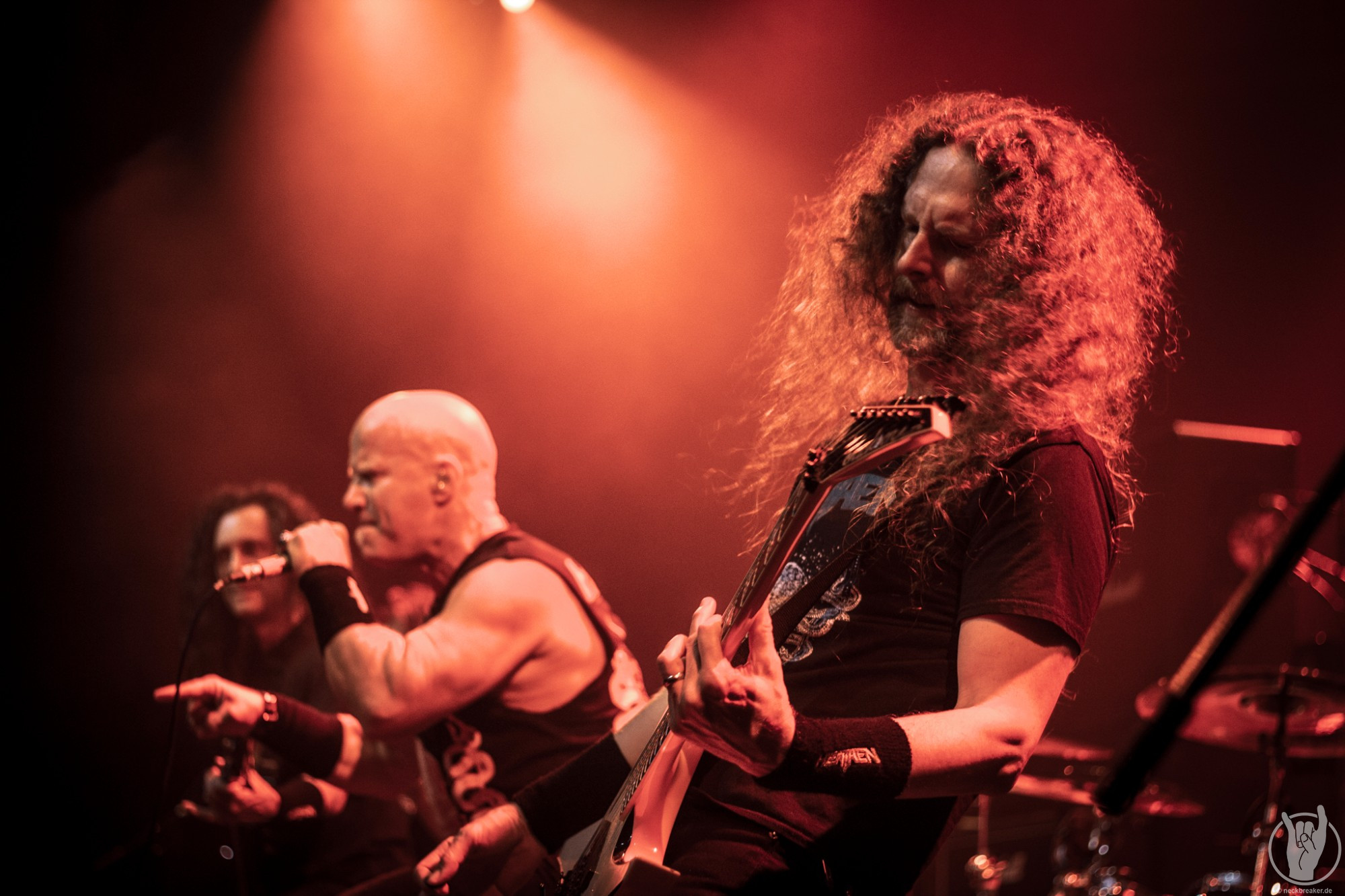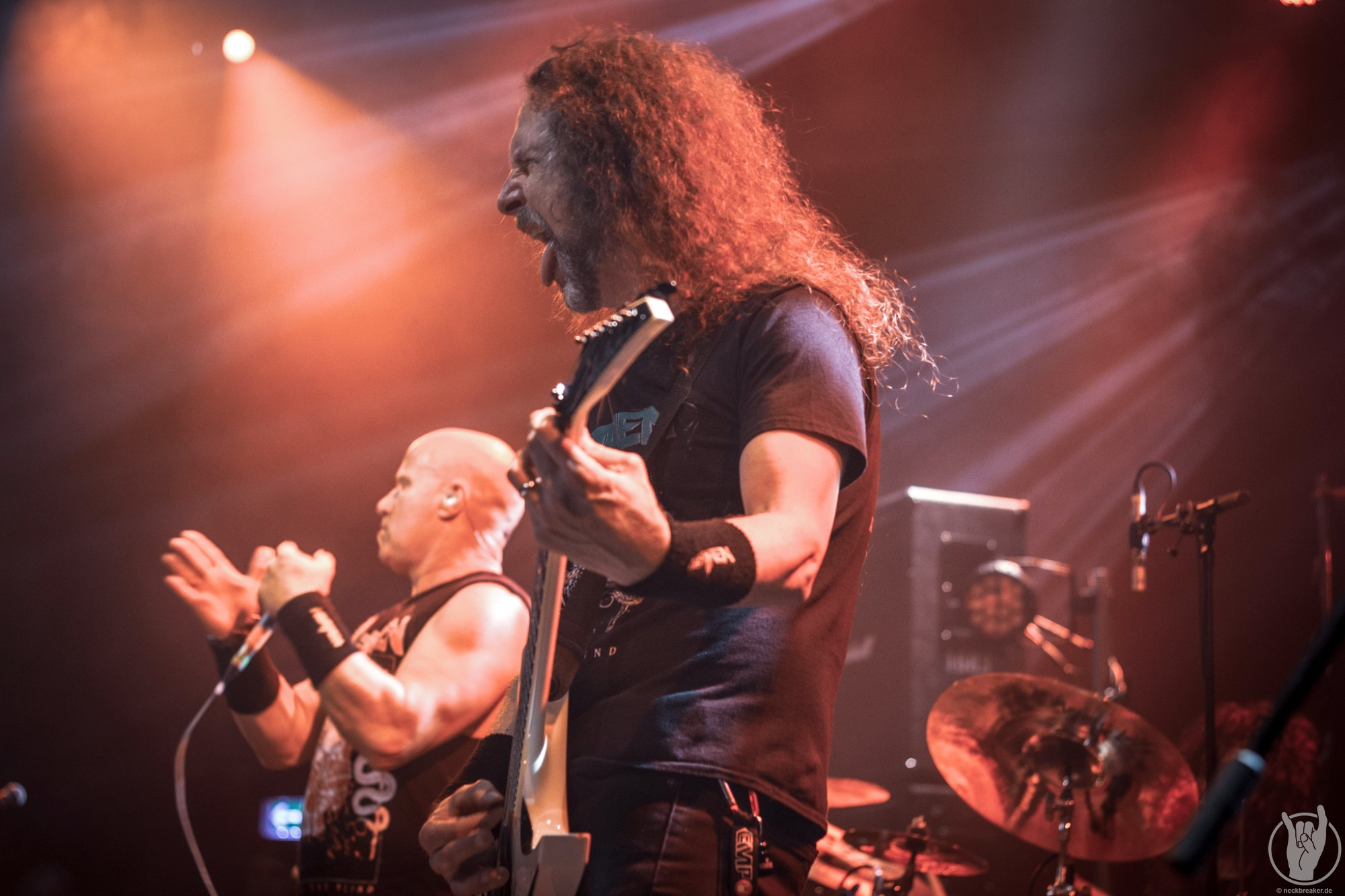Wie schon KEOPS zuvor betraten die meisten Musiker mit den eigenen Bandshirts die Bühne, was ich bei einer weniger bekannten Band noch verstehe, aber die Herren von HEATHEN brauchen eigentlich neben ihrer Mucke keine weitere Werbung. Bei ihrer Tour mit EXODUS vermisste man ihn schon, aber nun scheint Gitarrist Lee Altus endgültig hier nicht mehr mit von der Partie zu sein, was man ebenso auf das Alter schieben kann.