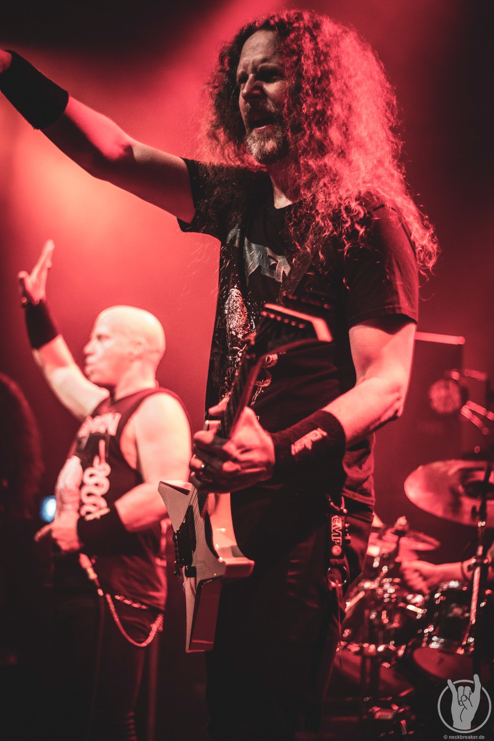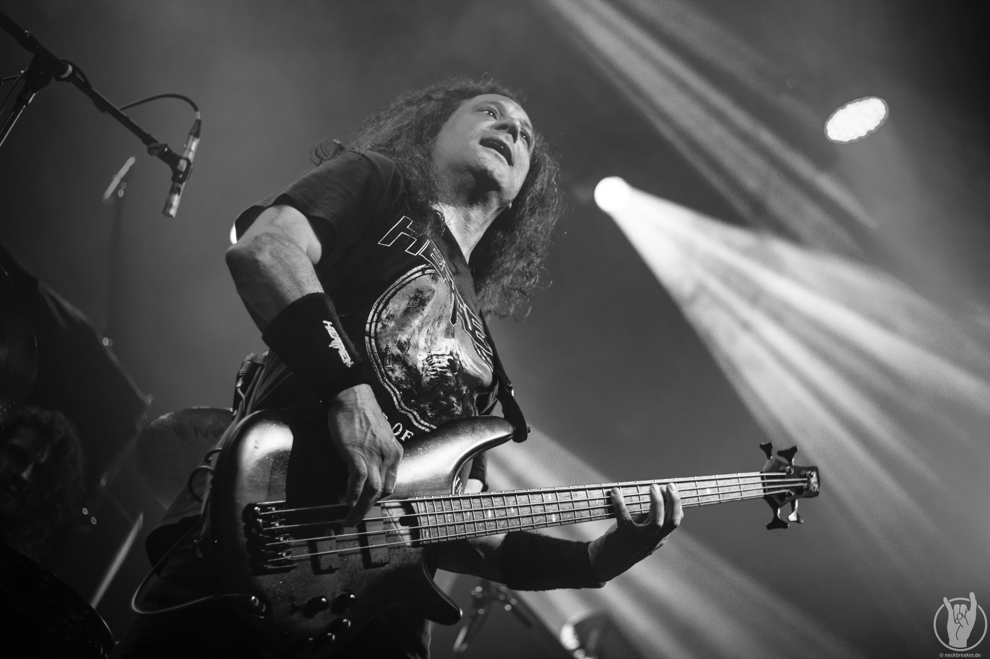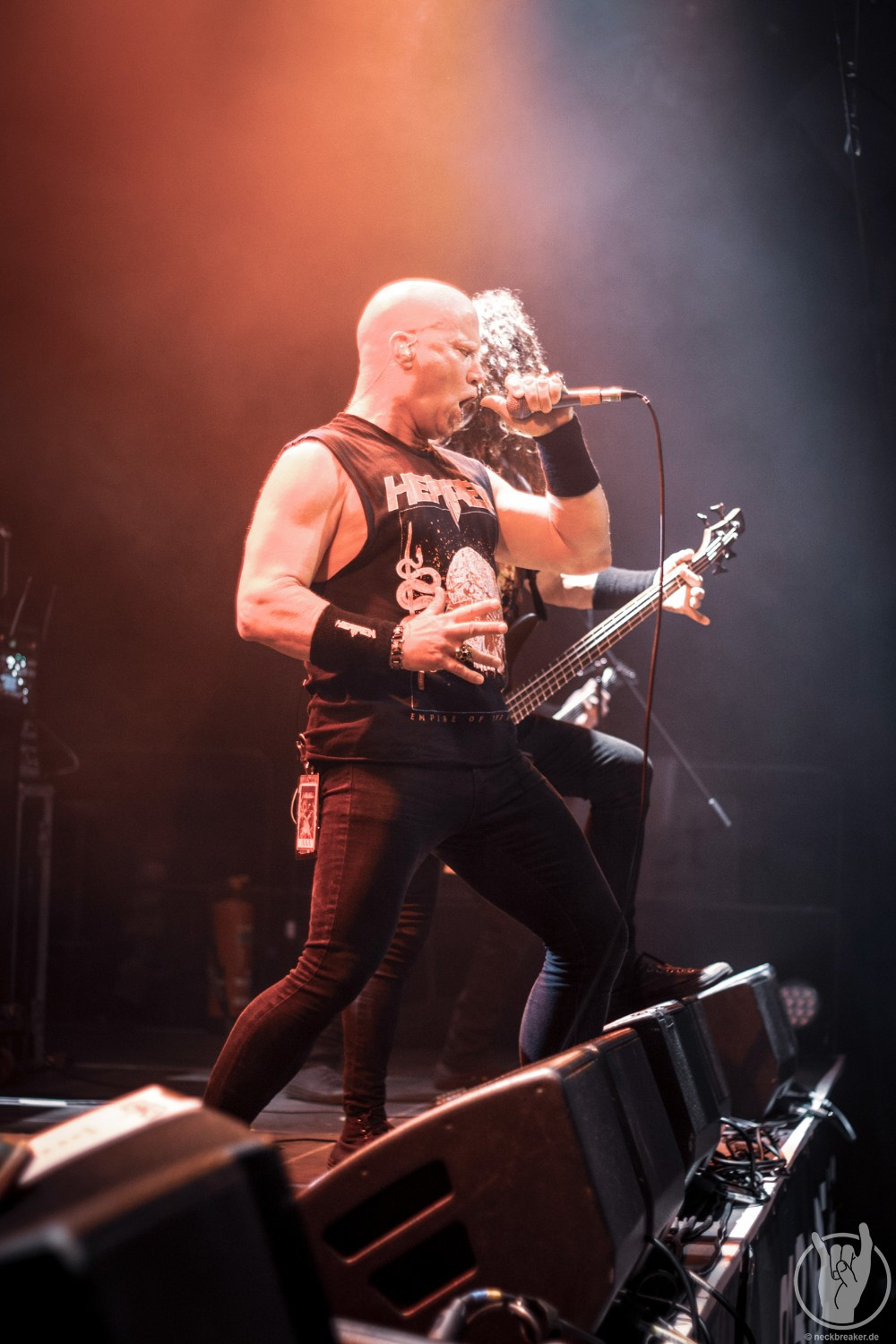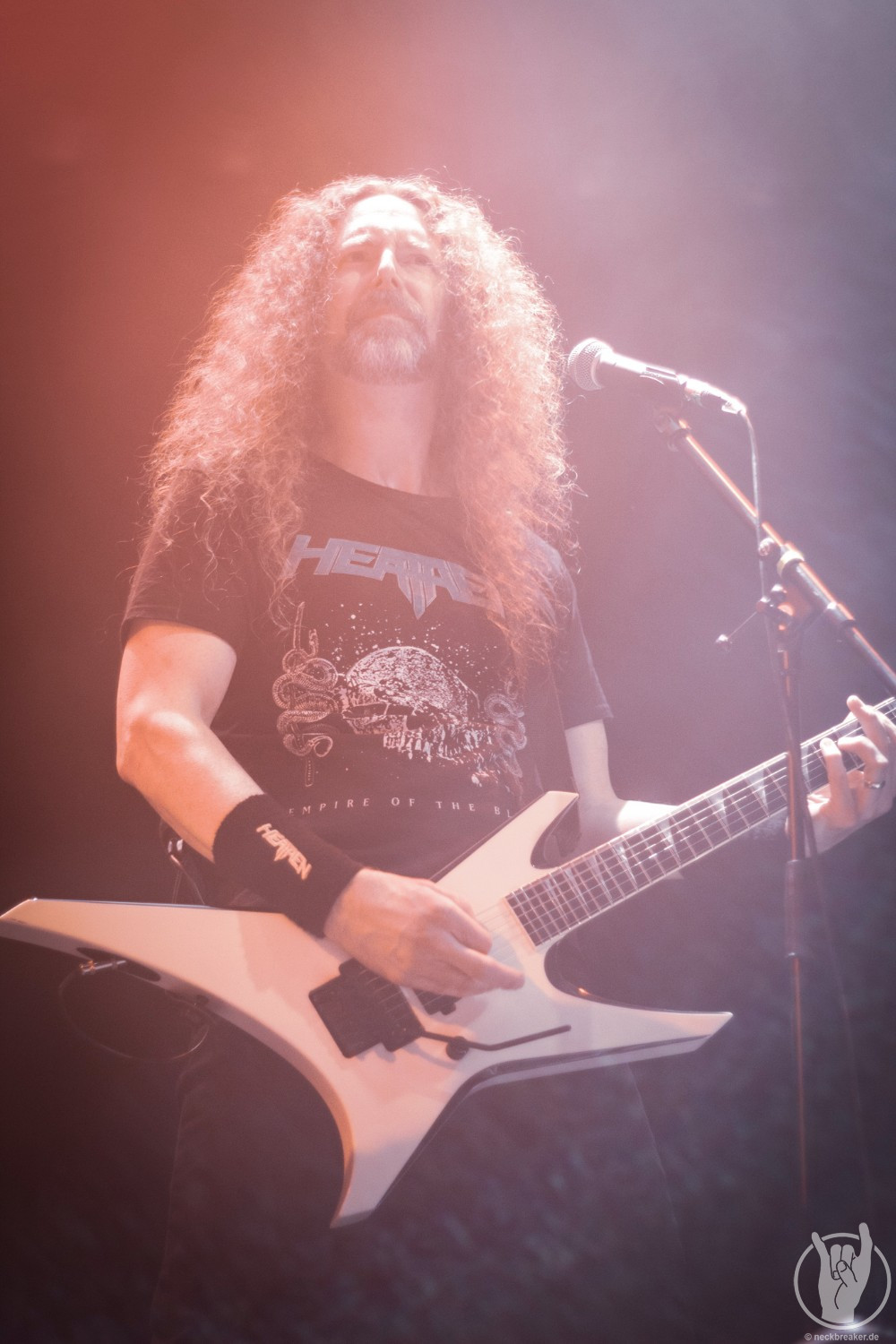 Wie schon KEOPS zuvor betraten die meisten Musiker mit den eigenen Bandshirts die Bühne, was ich bei einer weniger bekannten Band noch verstehe, aber die Herren von HEATHEN brauchen eigentlich neben ihrer Mucke keine weitere Werbung. Bei ihrer Tour mit EXODUS vermisste man ihn schon, aber nun scheint Gitarrist Lee Altus endgültig hier nicht mehr mit von der Partie zu sein, was man ebenso auf das Alter schieben kann.