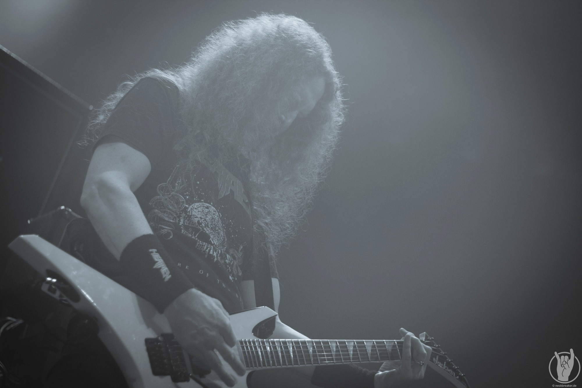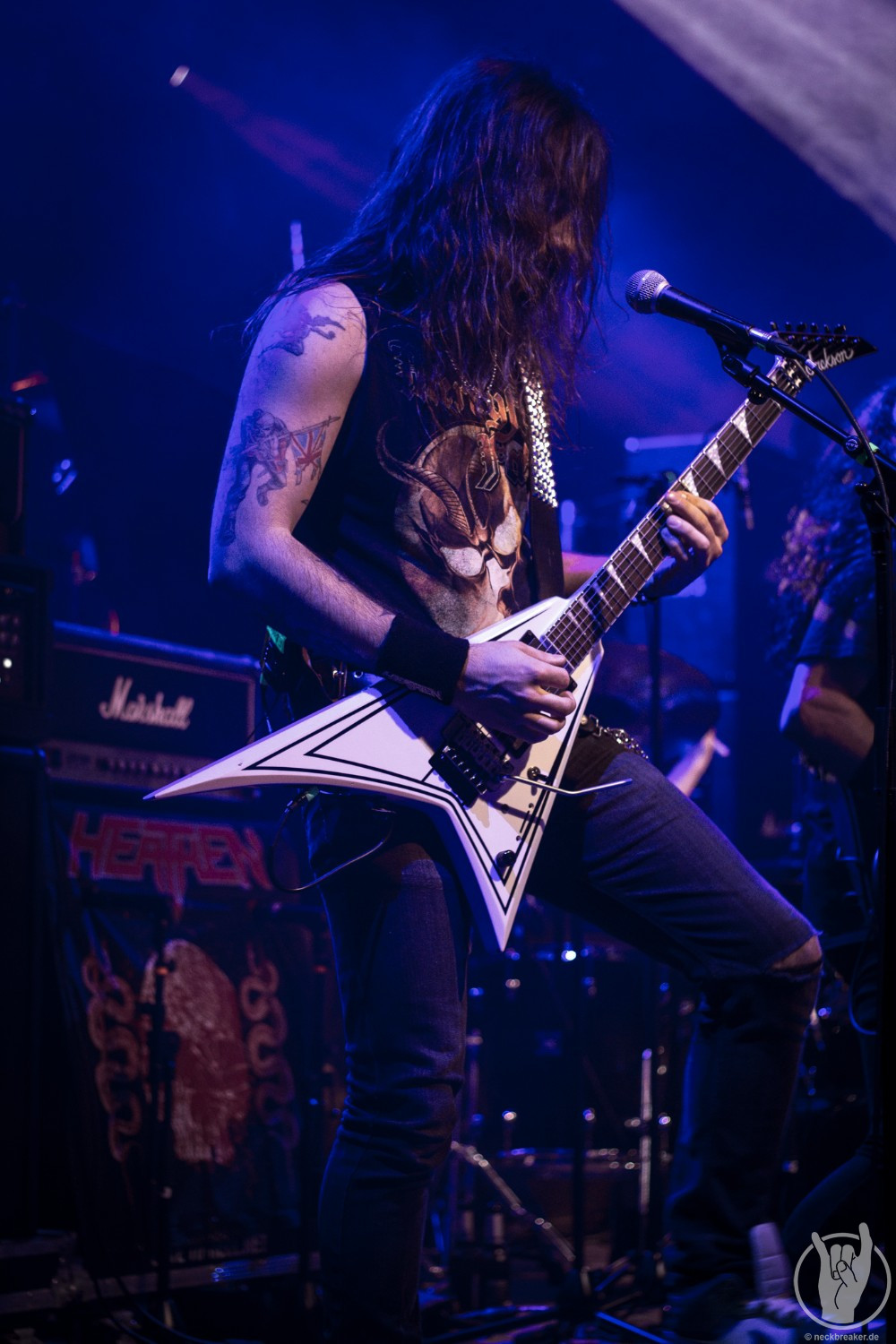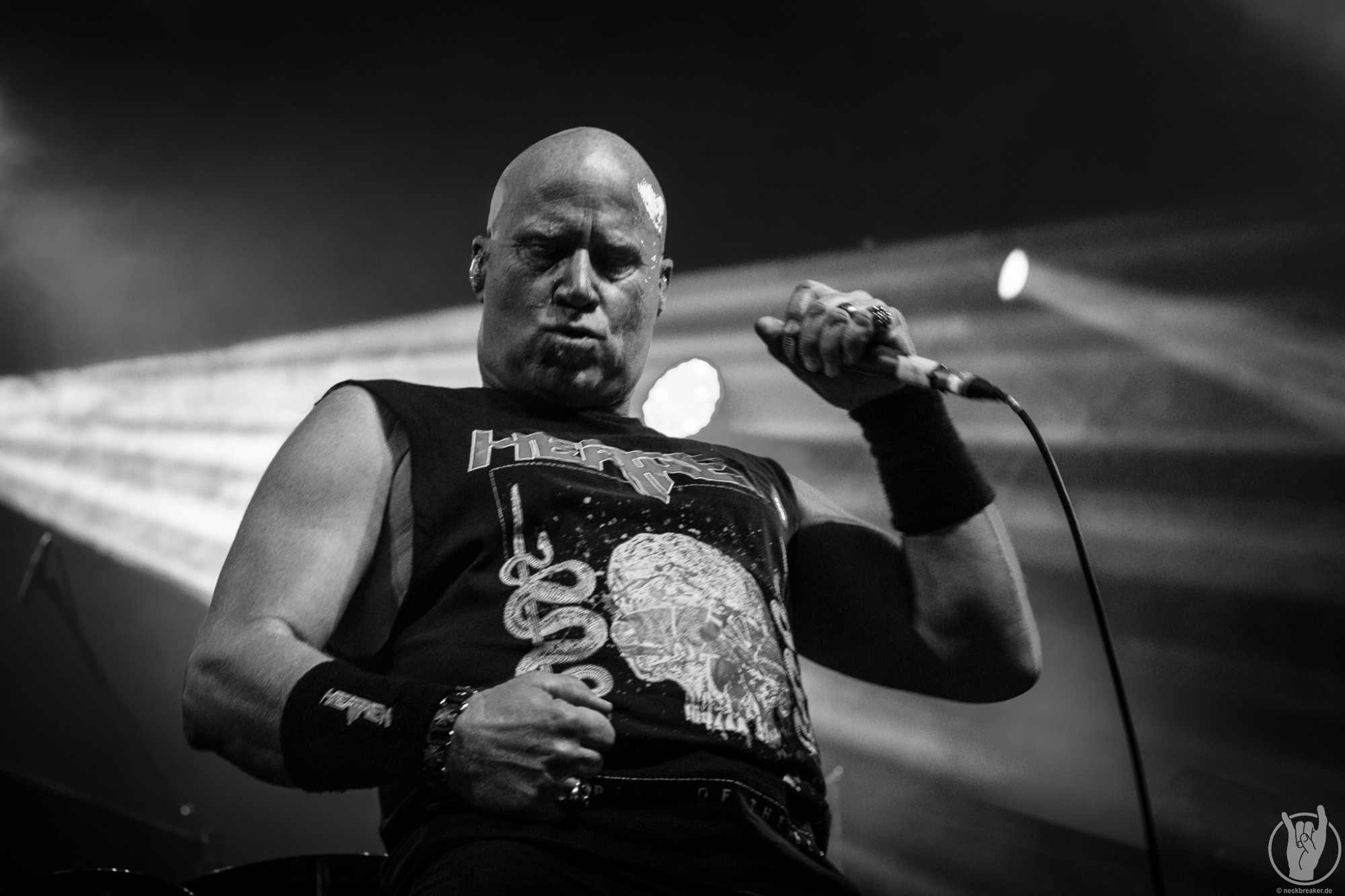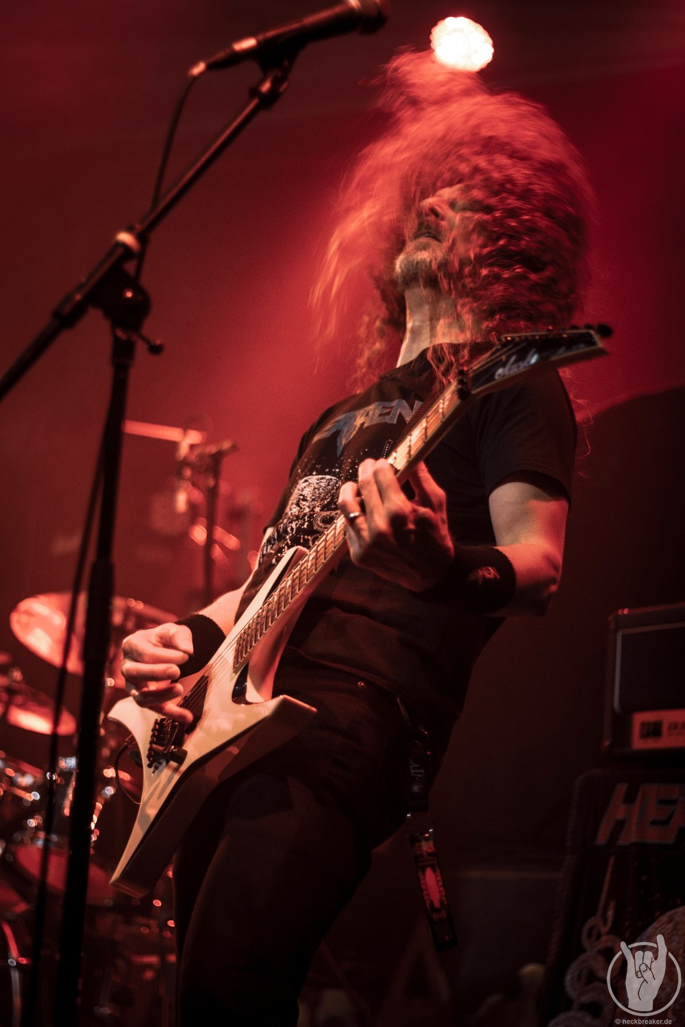 Wie schon KEOPS zuvor betraten die meisten Musiker mit den eigenen Bandshirts die Bühne, was ich bei einer weniger bekannten Band noch verstehe, aber die Herren von HEATHEN brauchen eigentlich neben ihrer Mucke keine weitere Werbung. Bei ihrer Tour mit EXODUS vermisste man ihn schon, aber nun scheint Gitarrist Lee Altus endgültig hier nicht mehr mit von der Partie zu sein, was man ebenso auf das Alter schieben kann.