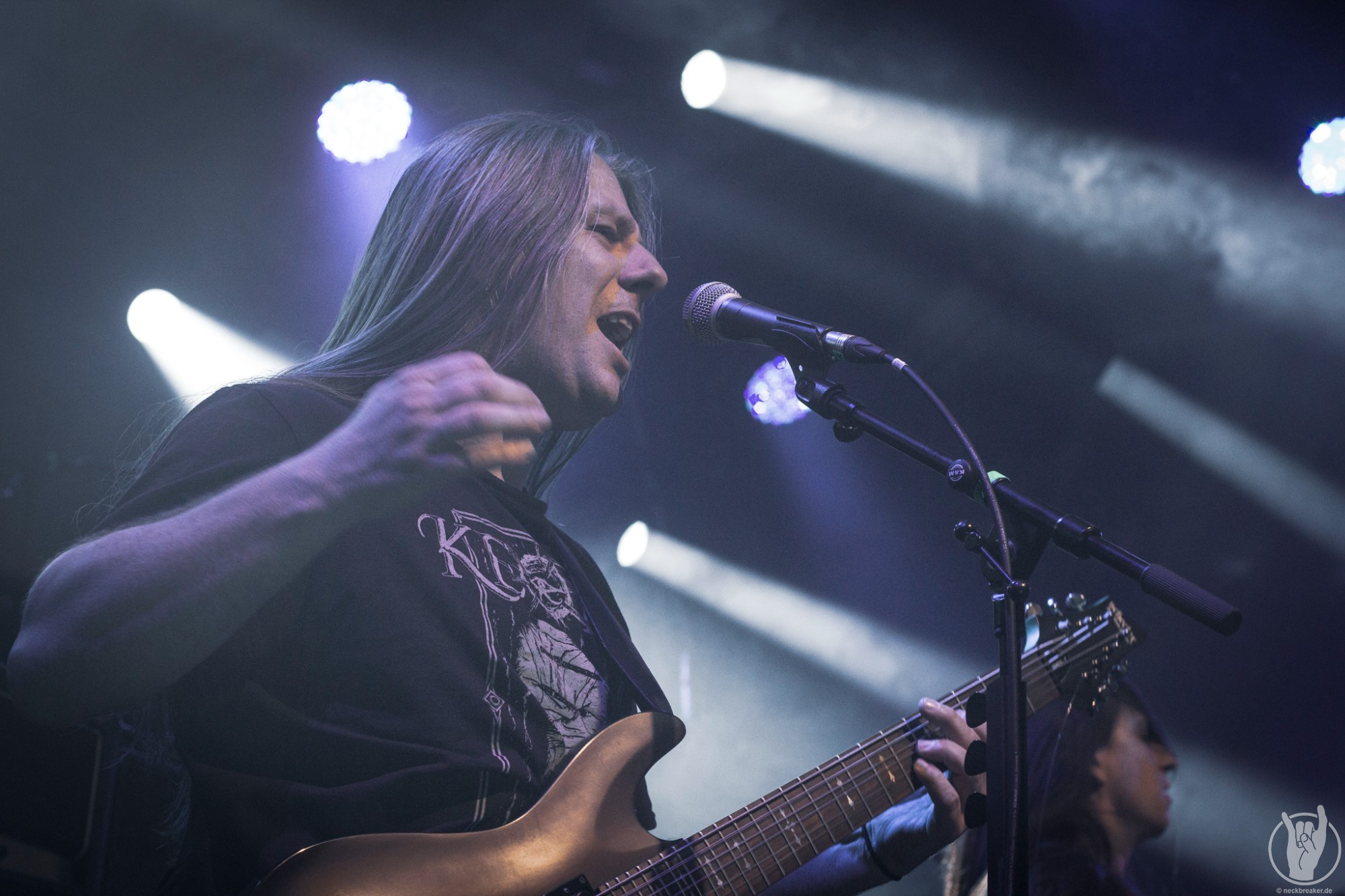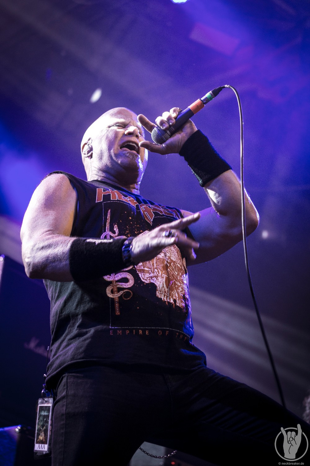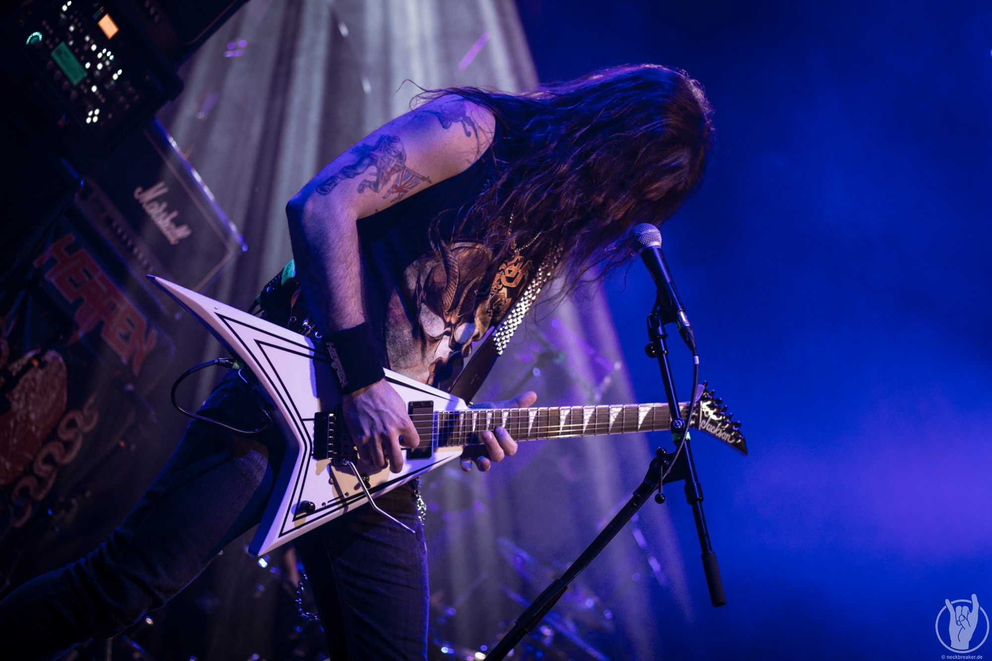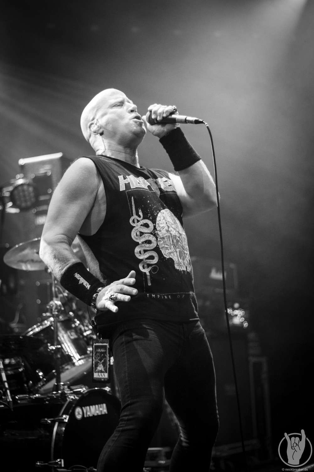 Wie schon KEOPS zuvor betraten die meisten Musiker mit den eigenen Bandshirts die Bühne, was ich bei einer weniger bekannten Band noch verstehe, aber die Herren von HEATHEN brauchen eigentlich neben ihrer Mucke keine weitere Werbung. Bei ihrer Tour mit EXODUS vermisste man ihn schon, aber nun scheint Gitarrist Lee Altus endgültig hier nicht mehr mit von der Partie zu sein, was man ebenso auf das Alter schieben kann.