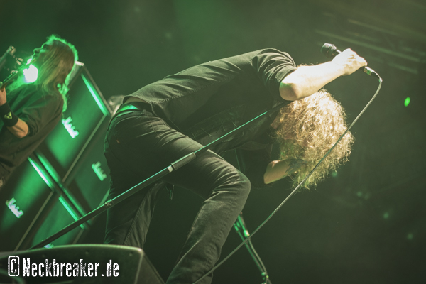 Es ist soweit, endlich sehe ich EXHORDER live. Wie bereits geschrieben hält sich die Euphorie dafür schwer zurück, woran liegt’s? Nun, nach all den Jahren, als sich EXHORDER reformiert und wieder getrennt haben, hat sich auch viel geändert, und einige Jahre sind ins Land gezogen. Mittlerweile ist nur noch Sänger Kyle Thomas von der Urbesetzung dabei, und auch wenn der Rest der Band sehr wertvolle Arbeit leistet, ist die Band meines Erachtens spätestens seit dem Weggang von Riffmeister Vinnie LaBella nicht mehr das Selbe. Abgesehen davon vermisste ich beim Reunion-Album „Mourn The Southern Skies“ vor vier Jahren einfach diesen einzigartigen rüden Gitarrensound, der schon damals seinesgleichen suchte. Im Vorfeld war ja schon klar, dass Waldemar Sorychta erneut an der zweiten Gitarre aushilft, da Pat O’Brien verständlicherweise noch Probleme beim Touren hat. Waldi hat sich allerdings schon zu Beginn der Tour das Bein gebrochen, so dass dieser auch gehandicapt auf die Bühne humpeln muss und mit drohendem Umfallen zu kämpfen hat.