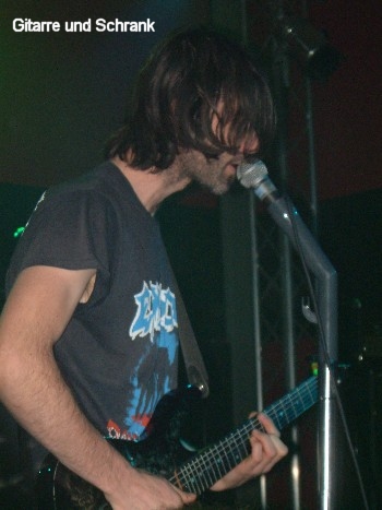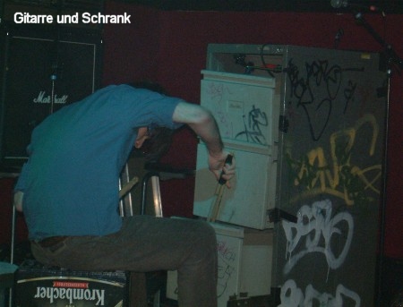 EXCREMENTORY GRINDFUCKERS, JAPANISCHE KAMPFHÖRSPIELE und JACK SLATER gastierten unterstützt von zwei weiteren Acts während ihr Fleischmarsch-Tour auch in Essen. Es war klar, dass das Turock voll werden würde, aber so voll ...?! "Ausverkauft!" wurde an diesem Abend gemeldet und entsprechend dicht gedrängt stand die Menge (500 Personen) um das wohl heißeste Grind-Package des Jahres abzufeiern. Zum Auftakt stand das kultige Berliner Duo GITARRE UND SCHRANK auf der, für die beiden viel zu großen, Bühne. Wer mit dem Namen nichts anfangen kann dem sei gesagt: Hier ist der Name absolut Programm. Deacon spielt Gitarre (und singt) und Stefan spielt den Schrank. Ja genau, er spielt den Schrank. Ein alter, arg mitgenommen aussehender Aktenschrank dient als Schlagzeugersatz und wird mit diversen Hölzern und einer Peitsche "bedient". Höhepunkt war wohl "Like A Virgin". Madonna hätte sich bestimmt auch nicht träumen lassen, dass das Stück mal so gespielt wird :-) Netter Opener, der allerdings nur wegen des Fun-Faktors zum Package passte, denn mit Grind hatte das wenig zu tun.