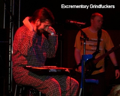 Den Spaßfaktor nach oben trieben dann schließlich noch die EXCREMENTORY GRINDFUCKERS. Sänger him, gesundheitlich durch eine Knieverletzung gehandicapt, betrat im Schlafanzug die Bühne. Ansonsten gab es aber keine Überraschungen. Die Setlist wieß kaum Unterschiede zum Auftritt auf dem Neckbreaker-Festival auf. Das Publikum feierte die Hannoveraner ordentlich ab und nutzte die Bühne beinahe im Sekundentakt zum Stagediving.