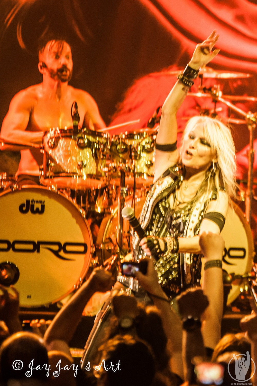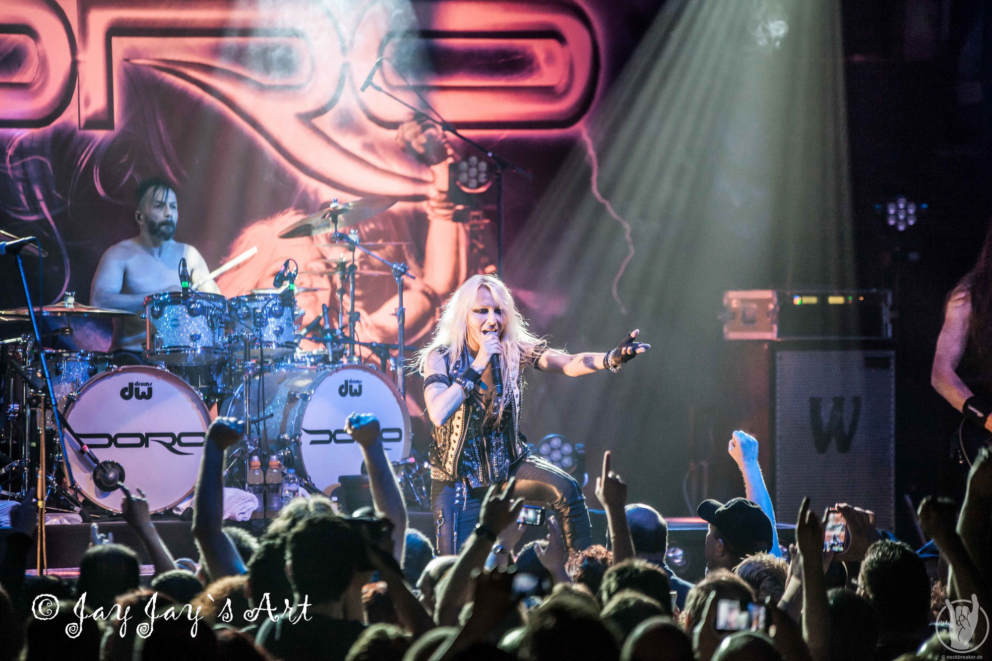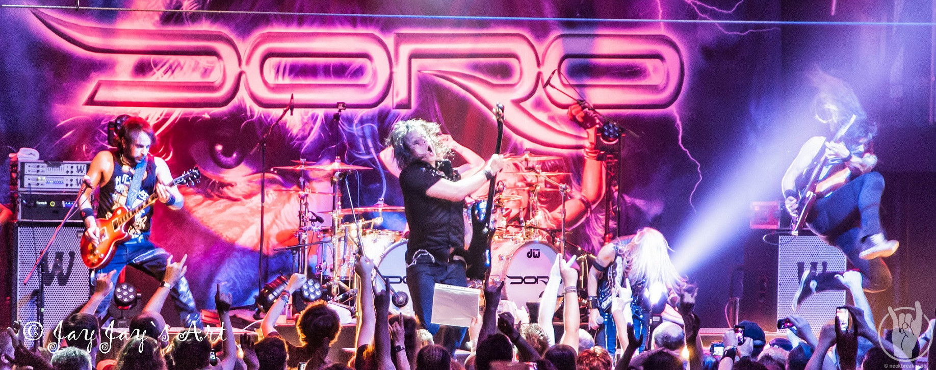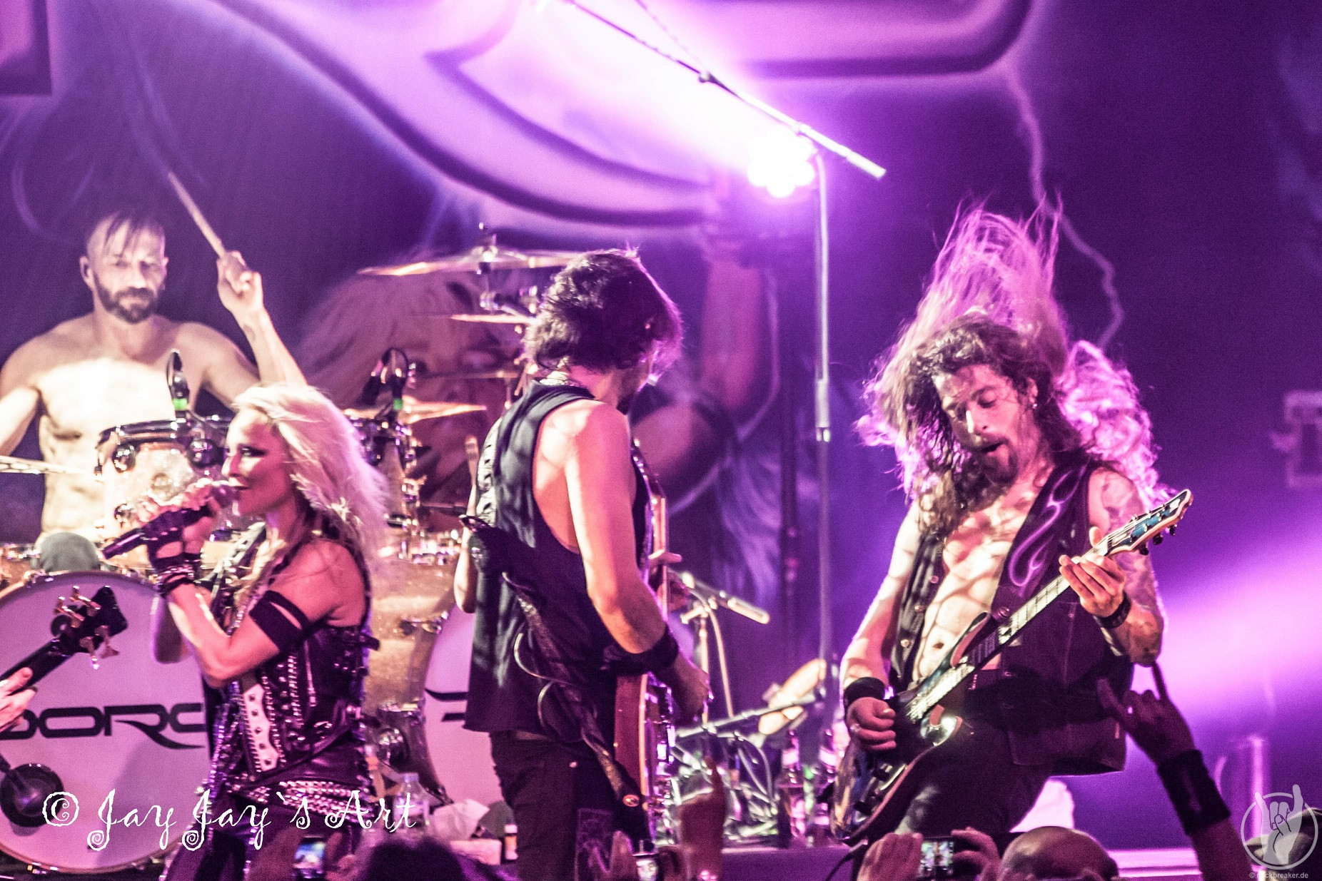 Nach der folgenden, gut vierzigminütigen Umbaupause ging das Licht in der Halle um 21:20 Uhr zum zweiten Mal aus. Nachdem bereits 15 Minuten vorher die ersten "Doro, Doro"-Chöre durch die Halle schallten, betrat die Band endlich unter frenetischem Jubel der Fans die Bühne. Nachdem Bassist Nick Douglas es sich erst mal nicht nehmen ließ, die vordersten Reihen komplett abzuklatschen, bretterten die Jungs gleich mal die vertrauten Klänge von "A Touch Of Evil" runter und zu diesen stürmte dann, wie man es von ihr gewohnt ist, DORO auf die Bühne. Auch sie ließ es sich nicht nehmen, in den Gesangspausen reichlich High Fives in den ersten Reihen zu verteilen, und auch das kennt man von dem blonden Energiebündel: ihre Fans sind einfach die Nummer Eins für sie und das zeigt sie gerne.