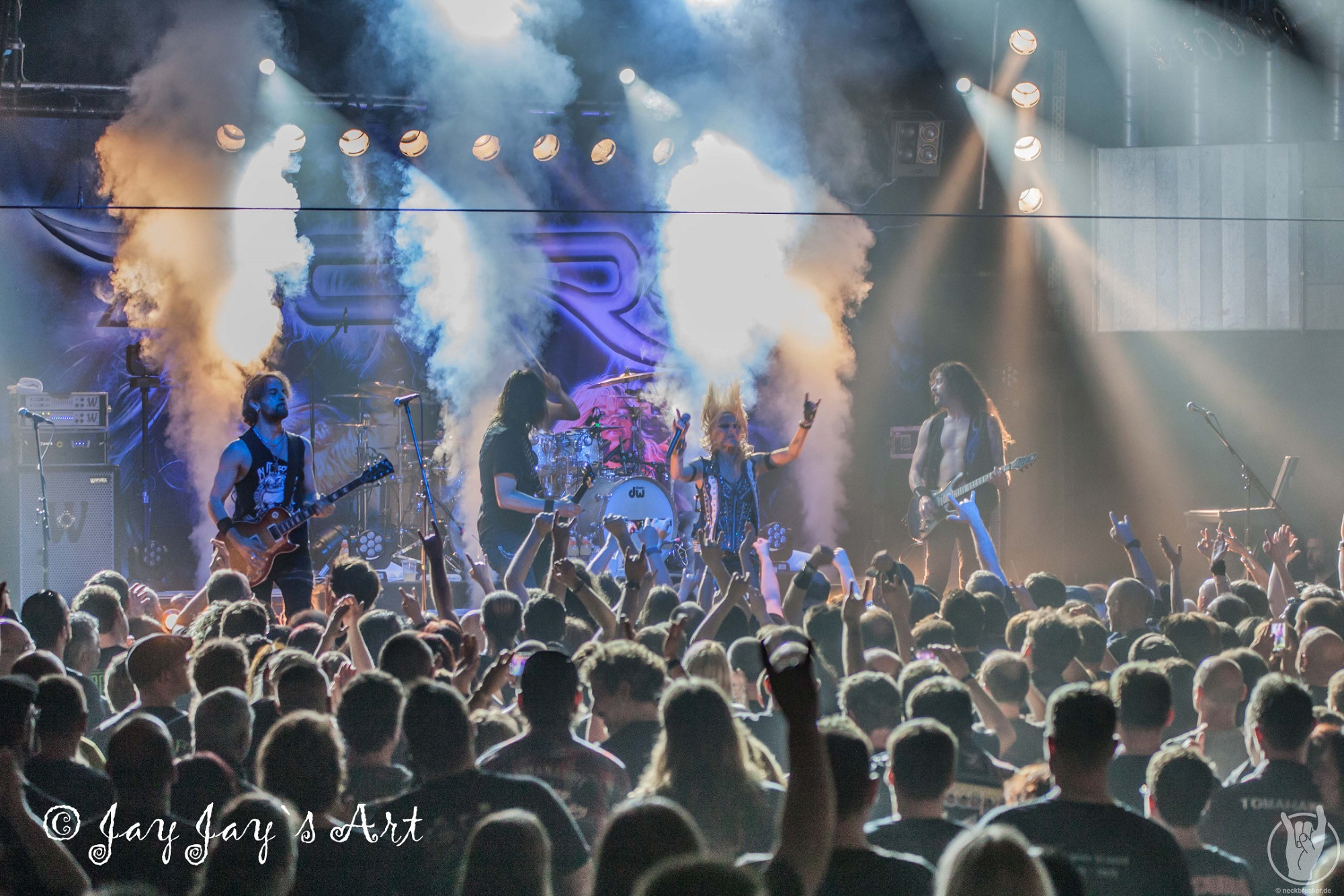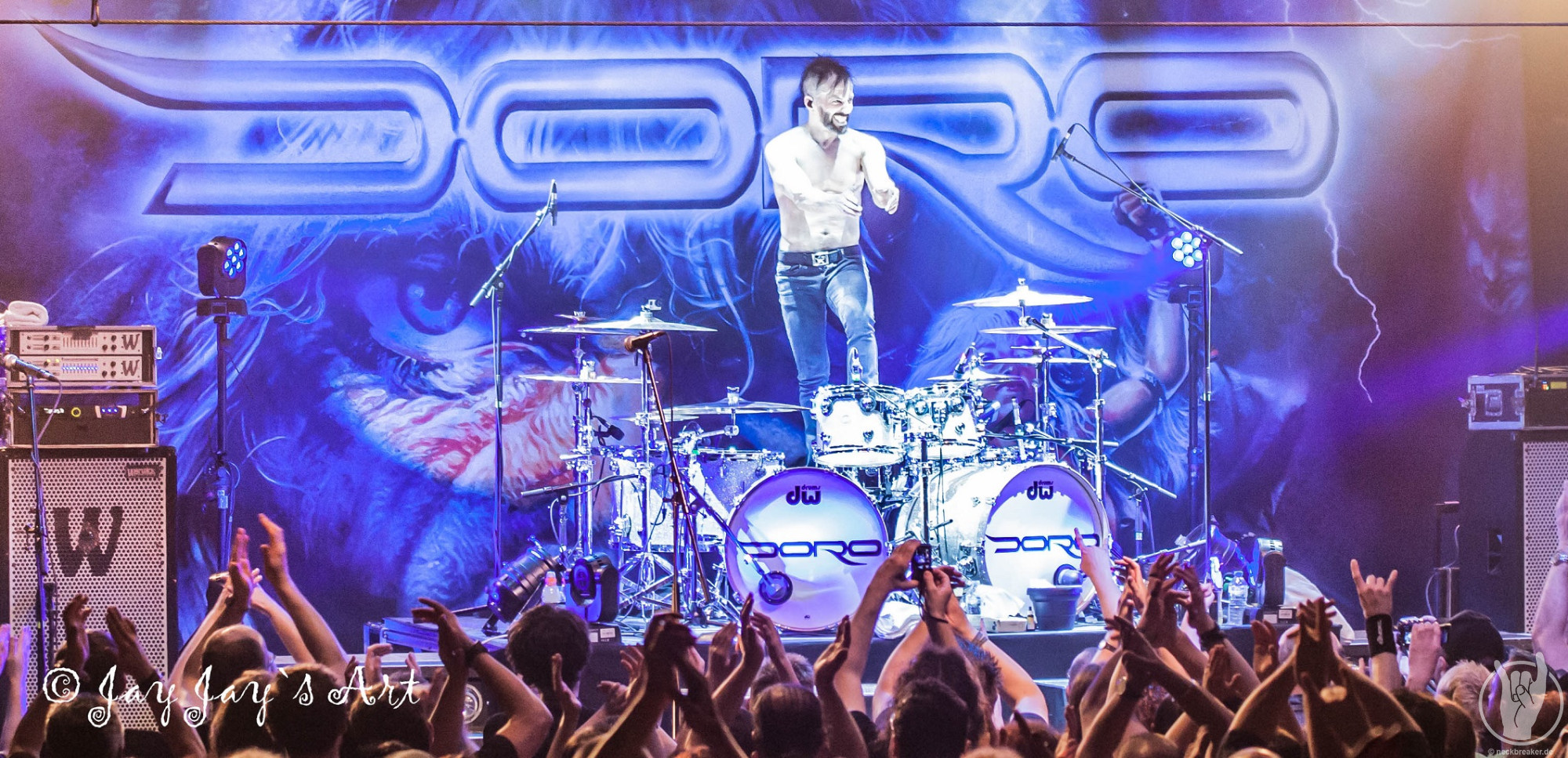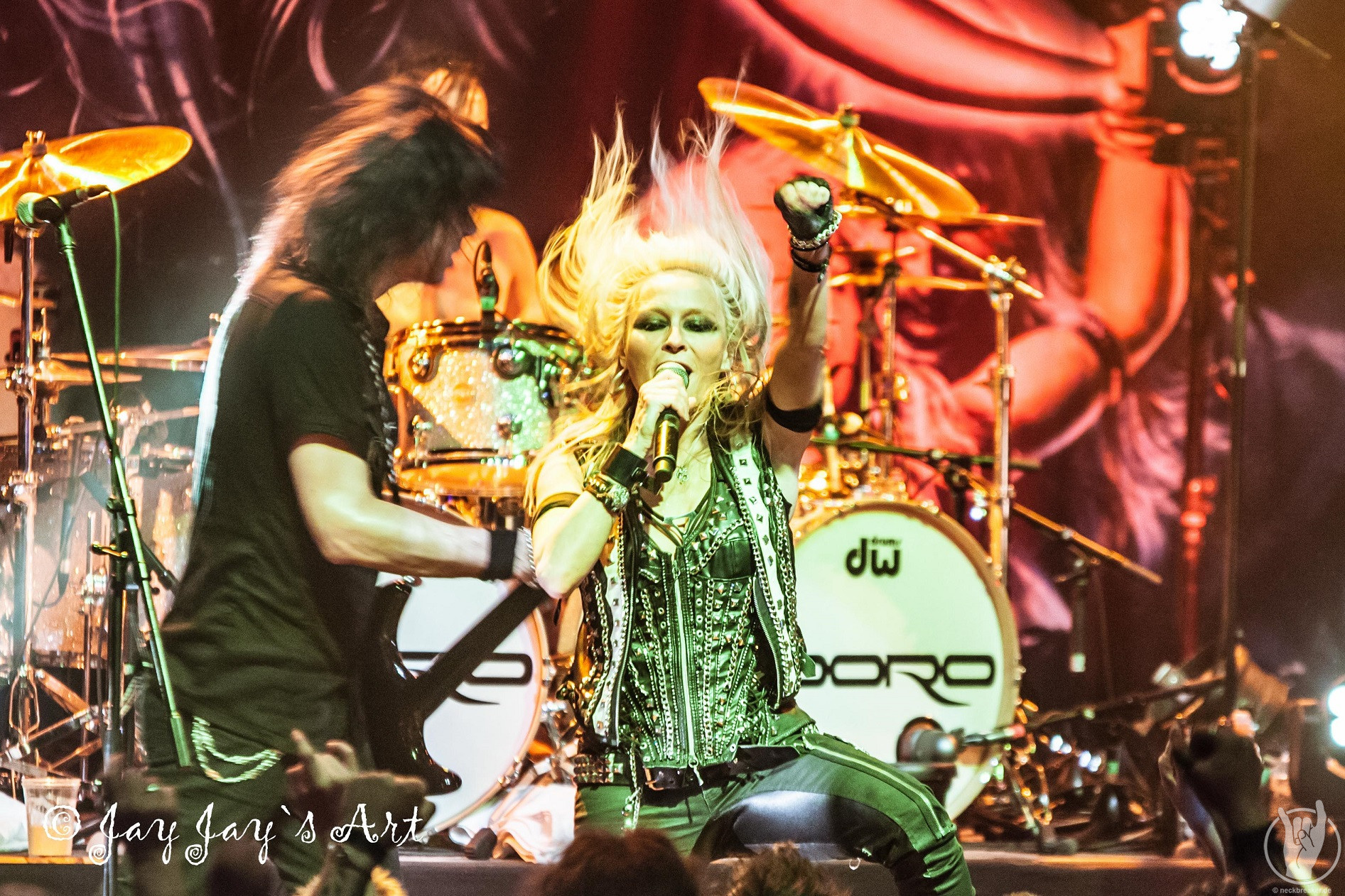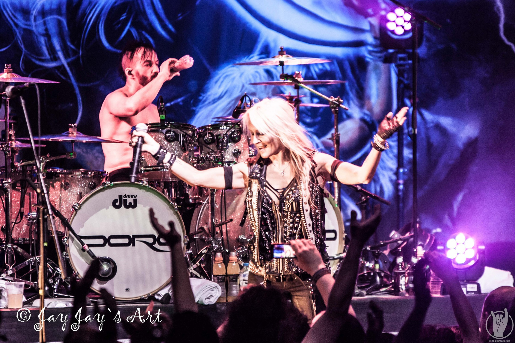 Nach der folgenden, gut vierzigminütigen Umbaupause ging das Licht in der Halle um 21:20 Uhr zum zweiten Mal aus. Nachdem bereits 15 Minuten vorher die ersten "Doro, Doro"-Chöre durch die Halle schallten, betrat die Band endlich unter frenetischem Jubel der Fans die Bühne. Nachdem Bassist Nick Douglas es sich erst mal nicht nehmen ließ, die vordersten Reihen komplett abzuklatschen, bretterten die Jungs gleich mal die vertrauten Klänge von "A Touch Of Evil" runter und zu diesen stürmte dann, wie man es von ihr gewohnt ist, DORO auf die Bühne. Auch sie ließ es sich nicht nehmen, in den Gesangspausen reichlich High Fives in den ersten Reihen zu verteilen, und auch das kennt man von dem blonden Energiebündel: ihre Fans sind einfach die Nummer Eins für sie und das zeigt sie gerne.