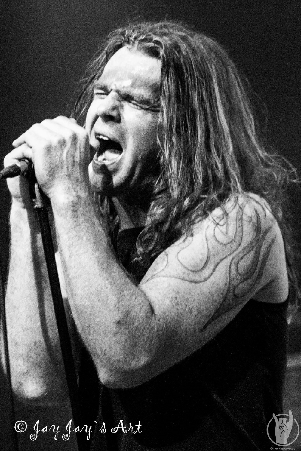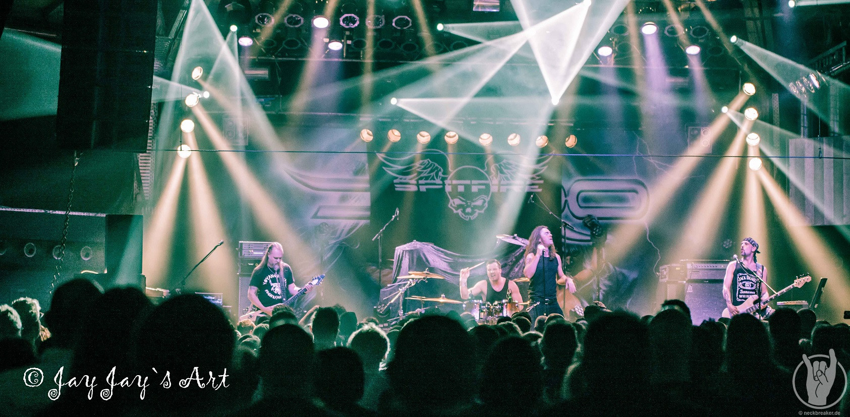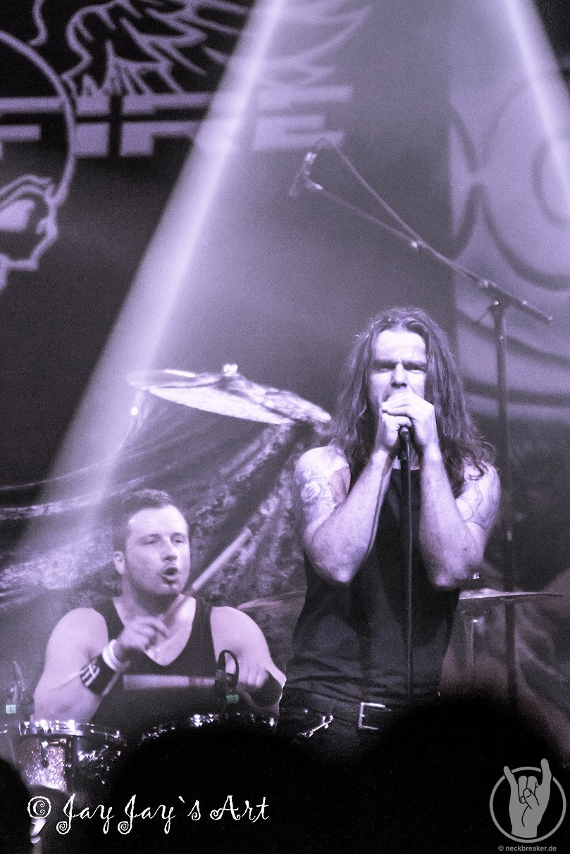 Die Norweger lieferten insgesamt eine gute, wenn auch nicht überragende Show. Allerdings ließ sich das Publikum davon überhaupt nicht beeindrucken und kam überhaupt nicht aus dem Quark. Da war nicht ein einziger im Publikum, der mal die Faust erhoben oder die Rübe geschüttelt hätte. Mir taten SPITFIRE daher schon fast ein bisschen leid. Da hatten sie schon mal das Glück, als Vorband eine fast volle Halle vorzufinden und dann kam vom Publikum überhaupt nichts zurück, auch wenn die einzelnen Songs brav mit Applaus honoriert wurden. Leute, wenn Ihr schon klatscht, dann bedeutet das doch, dass Ihr es gut findet - dann zeigt das doch bitte auch während der Songs und macht mit. Nach relativ kurzen 35 Minuten war der Auftritt der Norweger dann auch vorbei, und trotz der verhaltenen Publikumsreaktionen sprach der Sänger doch tatsächlich von "the best audience" - so viel Professionalität muss bewundert werden.